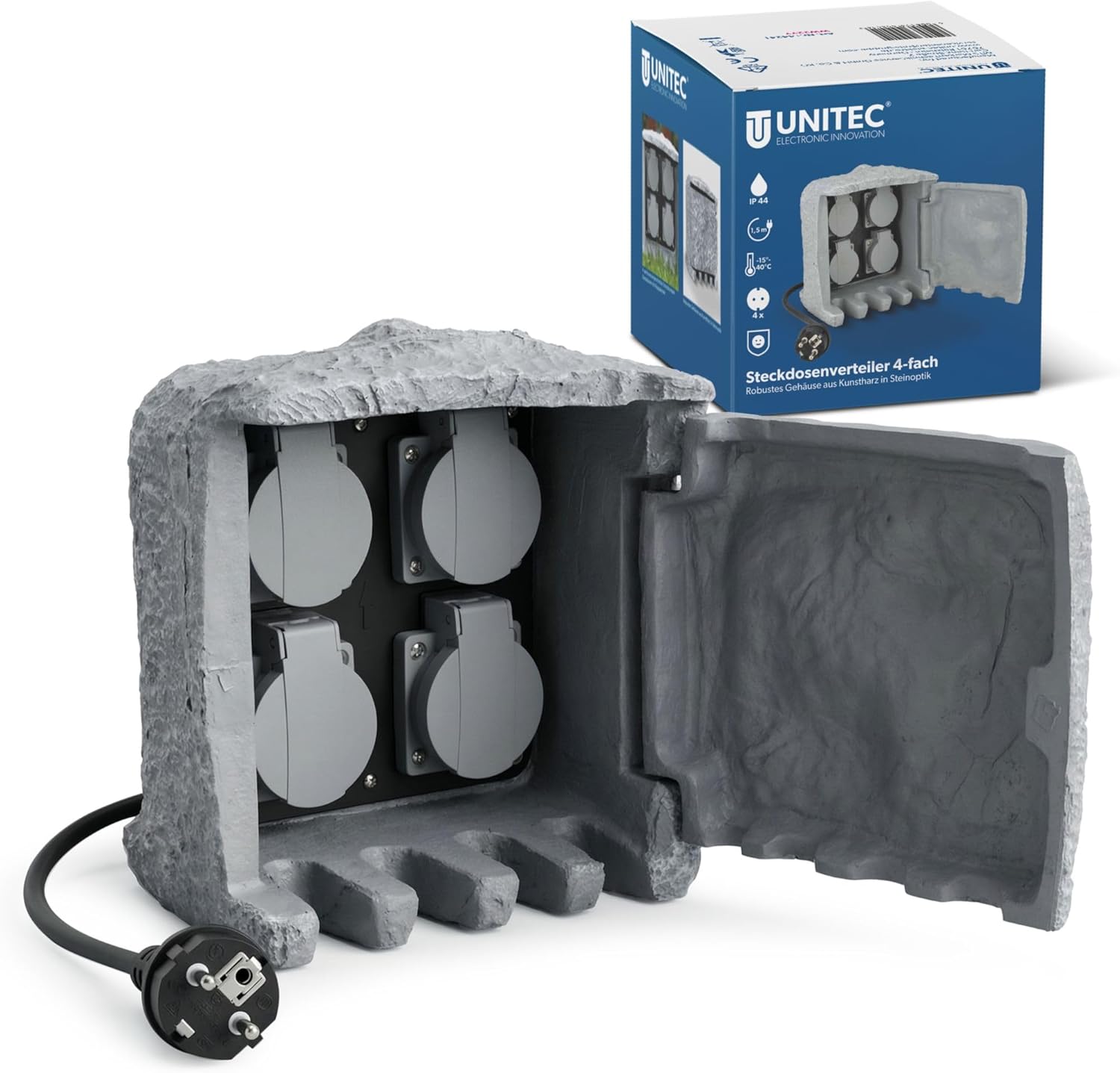 Der UNITEC Steckdosenverteiler für den Garten ergänzt die Außeninstallation mit einer künstlerischen Steinoptik. Mit vier Steckdosen bietet er Platz für mehrere Verbraucher im Außenbereich, ohne optisch störend zu wirken.
