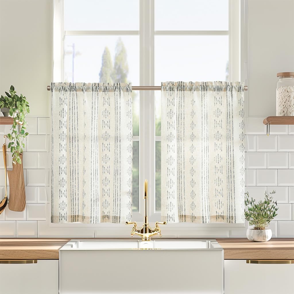 Vangao Scheibengardinen sind kurze Küchenvorhänge im 2er-Set mit Leinenoptik und einem geometrischen Streifen-Design. Auf dem Papier geht es dabei vor allem um eine unkomplizierte Montage und um den Look: Die Streifen sorgen für eine klare, moderne Boho-Anmutung, während der Stoff laut Hersteller aus einem Leinen-Polyester-Mix besteht.