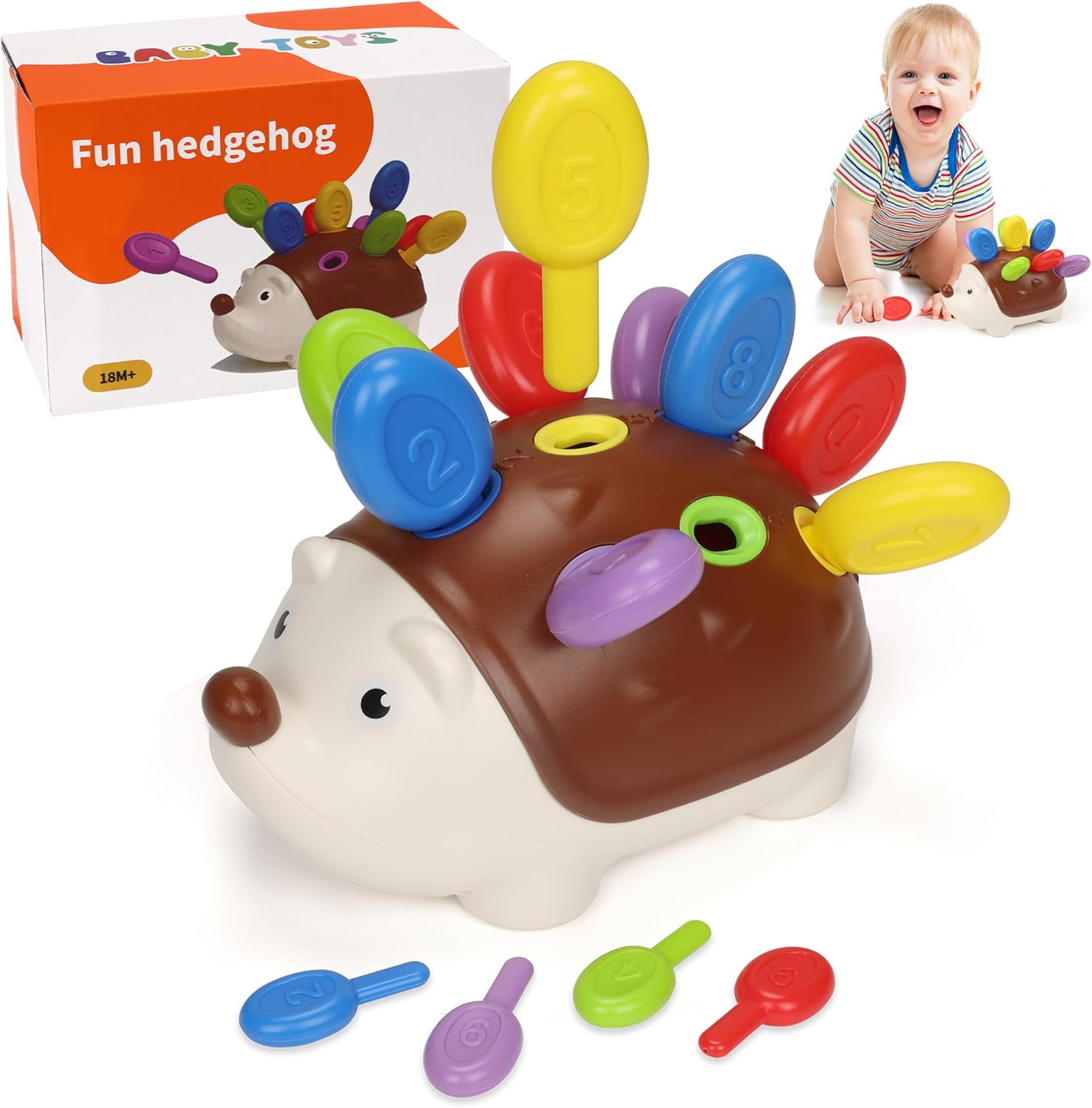 Das Spiel funktioniert über eine Rückseite mit Öffnungen: Auf der Rückseite sind Zahlen von 1 bis 10, und Kinder sollen die Stacheln (bzw. Stift-/Spike-Teile) in die passenden Löcher am Igelkörper stecken. Ob das für dein Kind sofort „zündet“, hängt allerdings ziemlich vom Entwicklungsstand ab: Mit knapp 1 Jahr klappt es oft eher als Freigreif-/Greifübung, während die Zuordnung von Farben und Zahlen eher mit etwas mehr Routine sinnvoll wird.