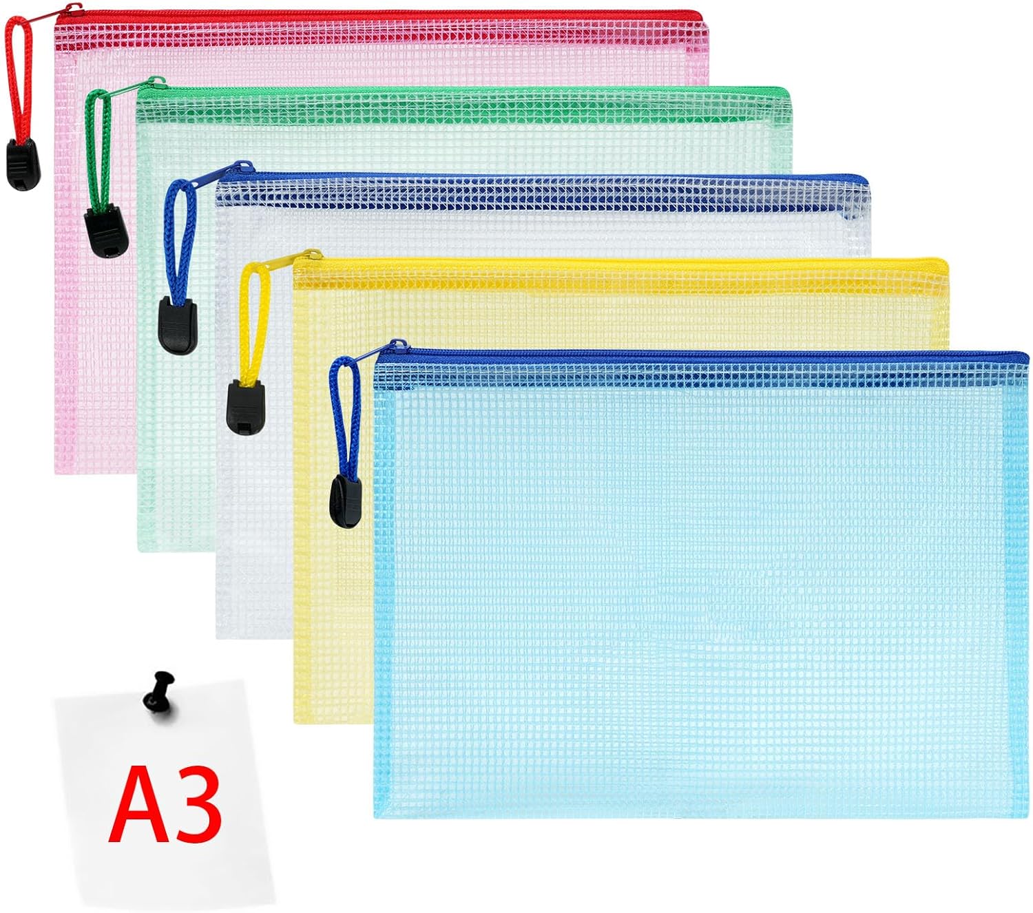Vicloon Dokumententasche A3 (5er-Set) – bunte, wasserdichte Zip-Taschen mit Mesh-Beutel