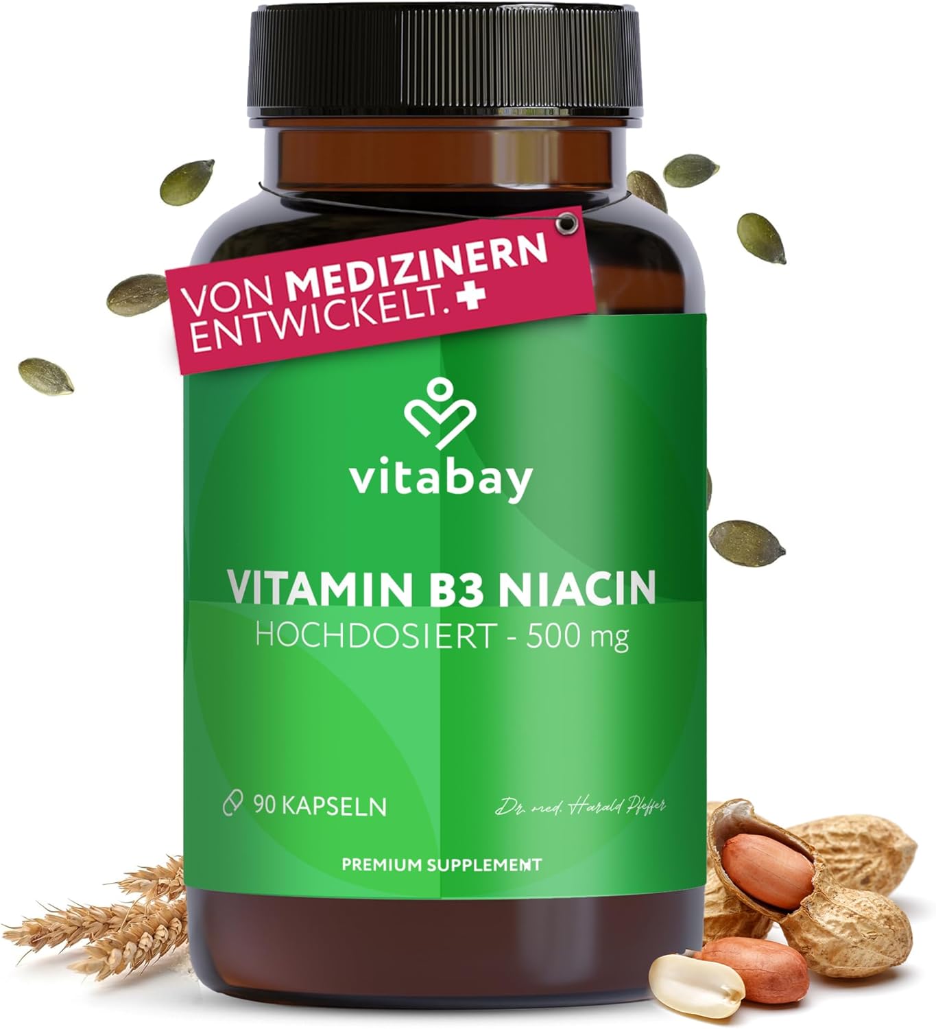 Vitabay bietet hochwertige Vitamin B3 Niacin Kapseln mit 500 mg pro Einheit an, die den normalen Energiestoffwechsel unterstützen und Müdigkeit reduzieren können. Die Kapseln sind vegan, flush free und frei von Zusatzstoffen, weshalb sie sich gut in eine bewusste Ernährungs- und Ergänzungsroutine integrieren lassen. Dank der rein biologischen Inhaltsstoffe eignen sich die Niacin Kapseln auch für Verbraucher mit besonderen Ansprüchen an Reinheit und Verarbeitung. Die regelmäßige Einnahme eine Kapsel pro Tag mit ausreichend Flüssigkeit sorgt laut Hersteller für eine maximale Wirkung und unterstützt die normale Funktion des Nervensystems. Die Laborprüfung und über 25 Jahre Erfahrung hinter diesem Produkt sprechen für eine verlässliche Qualität und eine schonende Herstellung, die auf eine maximale Wirksamkeit abzielt. Ein Fokus liegt darauf, unerwünschte Zusatzstoffe zu vermeiden und damit eine reine Niacin-Quelle zu bieten. Die Kombination aus hoher Dosierung und veganem Format richtet sich an Verbraucher, die eine unkomplizierte Ergänzung mit klarer Wirkkraft suchen. Die Herstellung nach internationalen Qualitätsnormen sorgt für Transparenz und Sicherheit im Alltag, was besonders für gesundheitsbewusste Käufer wichtig ist. 🟢 Die Niacin Kapseln tragen zur normalen Funktion des Nervensystems bei und unterstützen die Verringerung von Müdigkeit, was sie zu einer sinnvollen Ergänzung im täglichen Vitaminbedarf macht. 🟢 Dank der flush free-Form kann das Produkt angenehm eingenommen werden, ohne das typischen Hautrötungen zu befürchten. Die Einnahme ist einfach und die Wirkung lässt sich bei regelmäßiger Nutzung nachvollziehen. Die 90 Veganen Kapseln ermöglichen eine längere Anwendung, ohne häufig nachkaufen zu müssen. Insgesamt bietet Vitabay eine klare und verlässliche Niacinquelle mit hoher Dosierung, ideal für Menschen, die Wert auf klare Inhaltsstoffe legen.