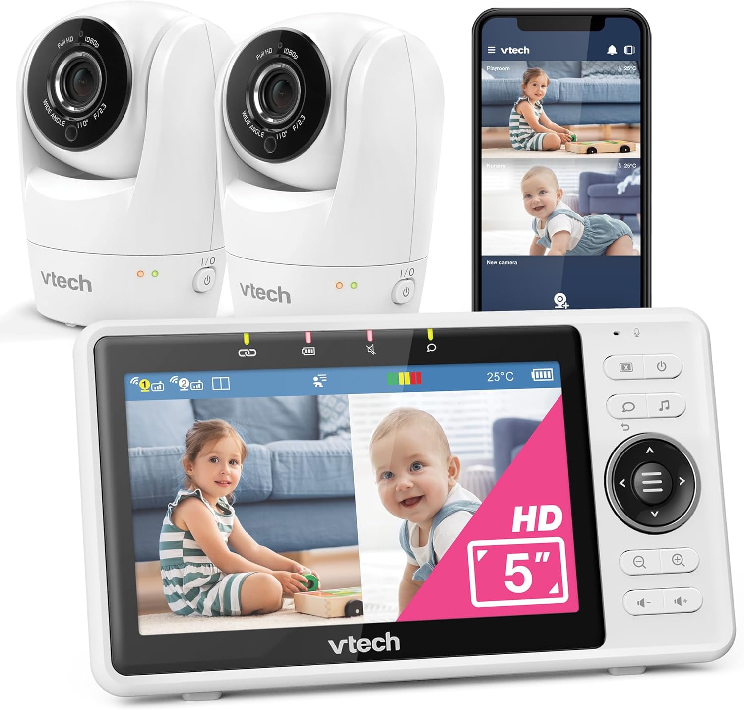 - Name: Vtech Smart Babyphone mit 2 Kameras, 1080p-FHD-Kamera und 5-Zoll-HD-IPS-Bildschirm, WLAN, Geräusch- und Bewegungserkennung, Temperatursensor, geteiltem Bildschirm, Schwenk-Neige-Zoom, VM901-2W