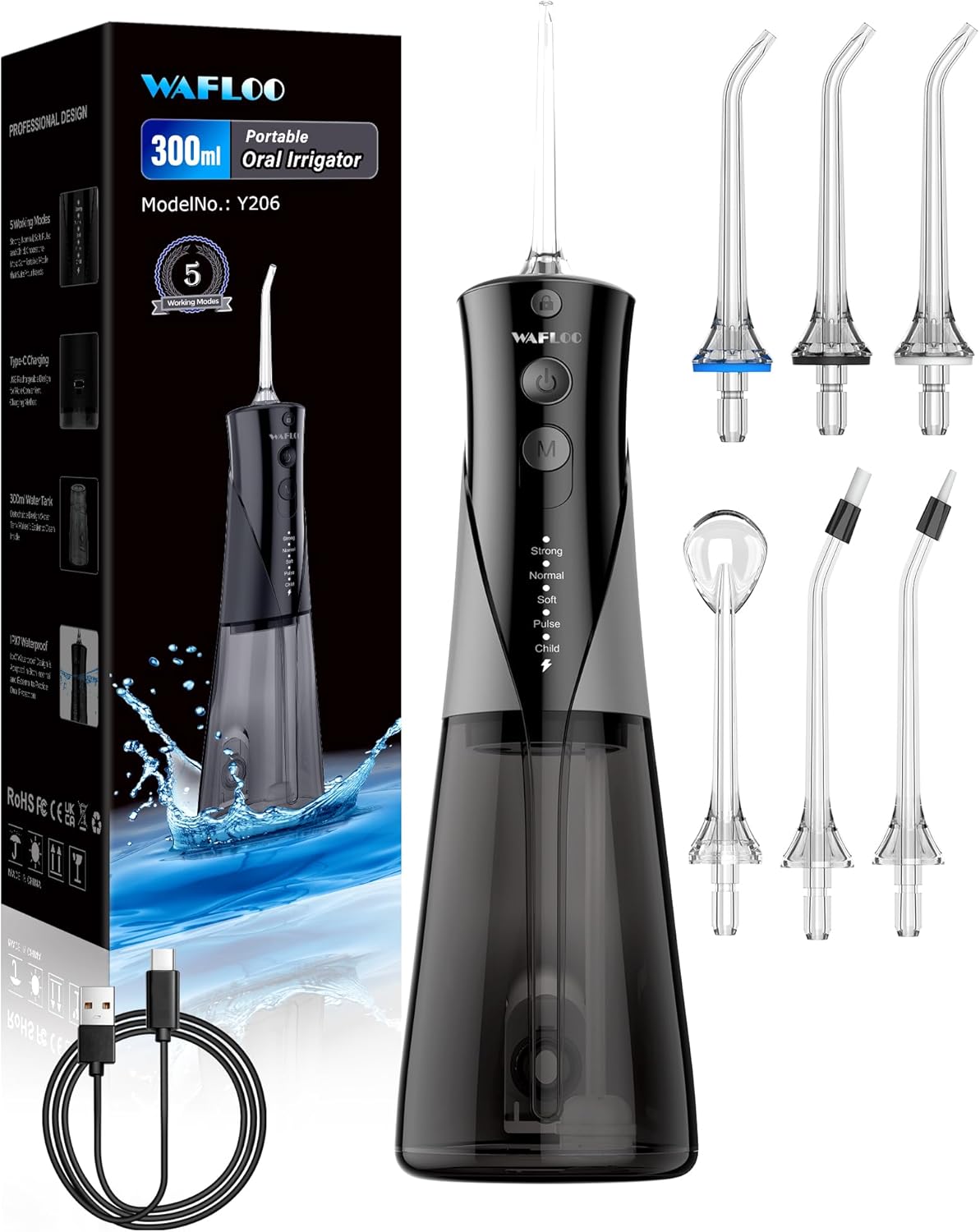 WAFLOO Munddusche kabellos Water Flosser mit USB-C, 5 Modi und 300 ml Wassertank (Schwarz)