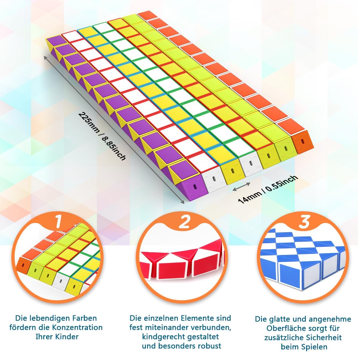 Der magische Schlangenwürfel besteht aus 24 Segmenten pro Stück und wird im 12er-Set geliefert, sodass mehrere Kinder gleichzeitig spielen können. Die Module sind aus ABS-Kunststoff gefertigt und laut Hersteller mit glatten Kanten versehen, um Finger zu schützen. Farben wie Rot-Weiß, Blau-Weiß und Grün-Weiß kommen in einer Zufallsauswahl, was die Überraschung beim Auspacken erhöht. Dieses kleine Spielzeug eignet sich sowohl für Gruppenaktivitäten in der Schule als auch für gemütliches Basteln zu Hause.