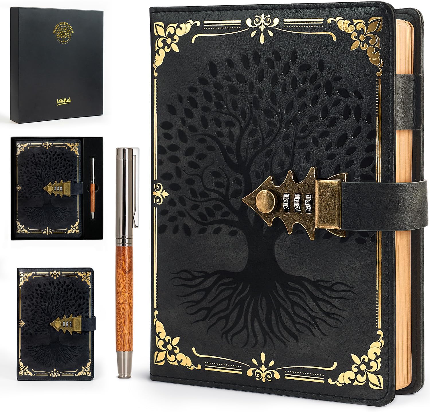Dieses verschließbare WEMATE Tagebuch im A5-Format kombiniert Schutz und Stil. Das Hardcover-Journal bietet 260 Seiten aus 100 g Vintage-Papier, zwei Lesebändchen und ein retro Metallschloss mit Baumprägung, das sich per Zahlenkombination öffnen lässt. Ideal für Notizen, persönliche Einträge oder als Geschenk mit beiliegender Geschenkbox und Metallstift.