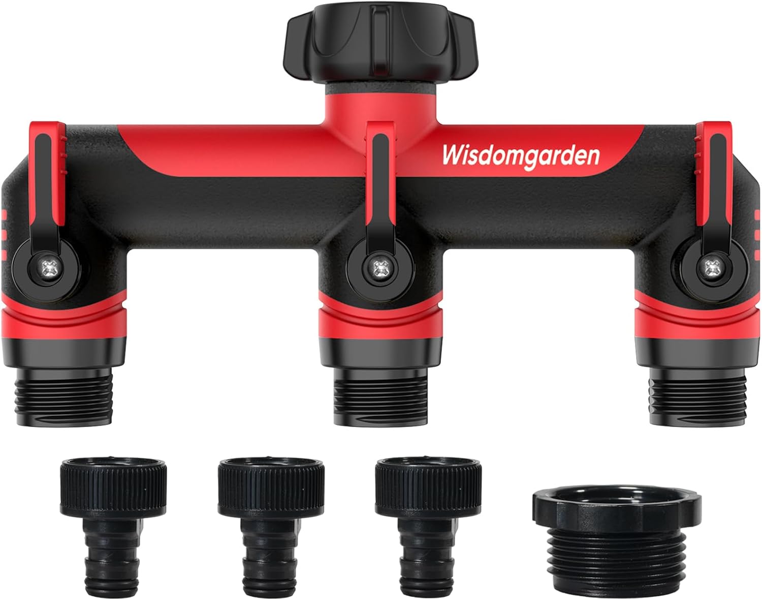 Wisdomgarden 3-Wege-Wasserverteiler für 3 Geräte am Wasserhahn (3/4 Zoll) – Wasserverteiler rot/schwarz