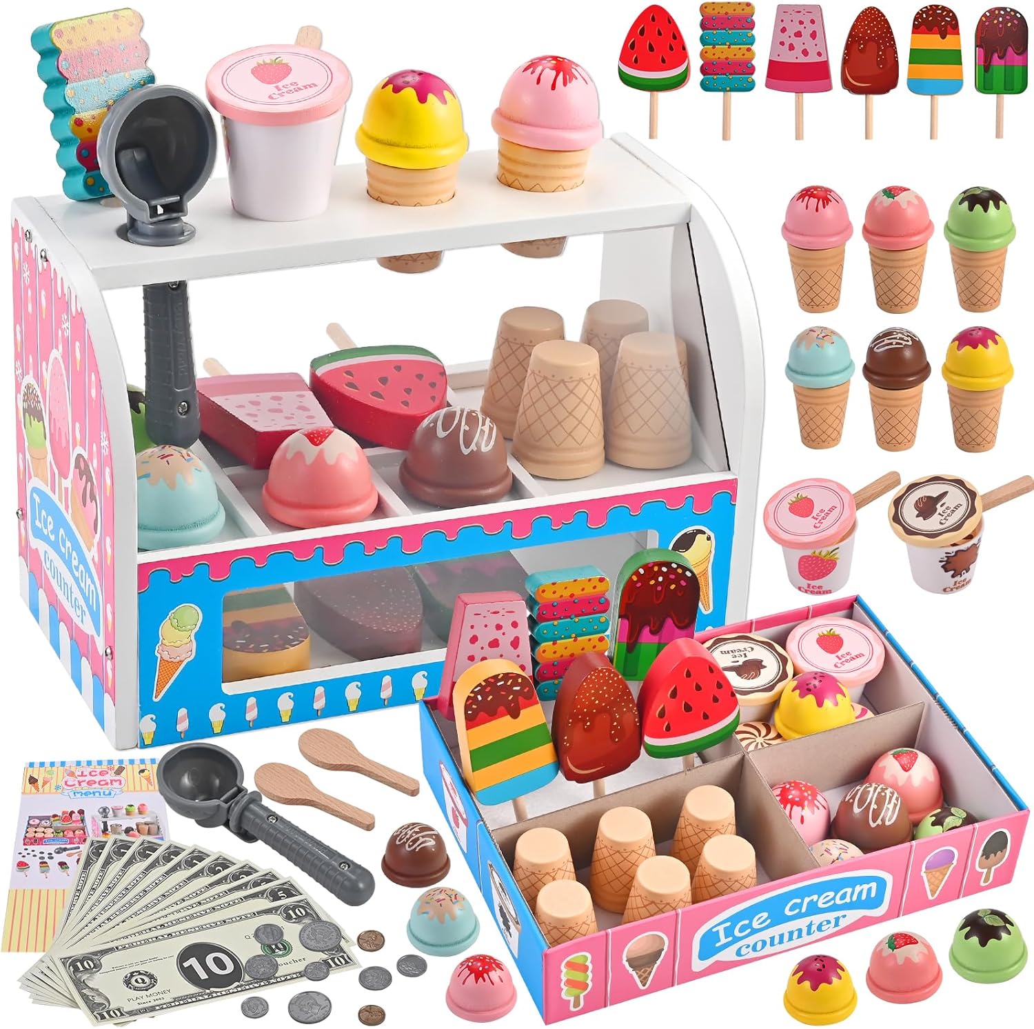- Melissa & Doug Eisdiele aus Holz, 28-teilig (mit Spielgeld) – Rollenspiel für Eiscreme im Laden