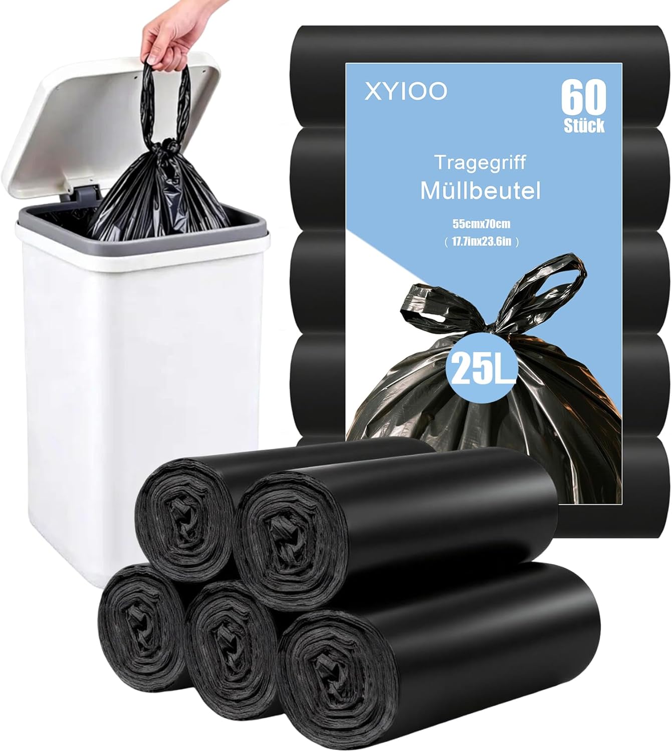 XIYOO schwarze Müllbeutel 25L mit Tragegriff (55x70 cm) – reißfest, blickdicht, 60 Stück