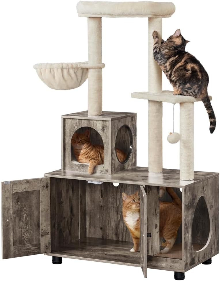 Yaheetech Katzenbaum mit Katzenklo Schrank (134,5 cm) – 2-in-1 Kratzbaum & Katzentoiletten-Schrank in Greige-Beige