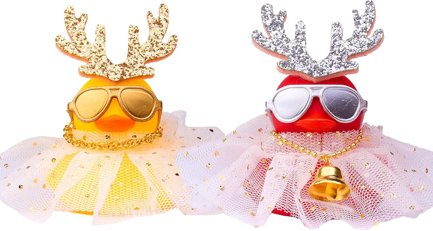 Mwmoeen Weihnachts-Gummi-Enten für Auto & Deko, 2er-Set (mit Spitzenkleid, Mini-Geweih & Sonnenbrille)