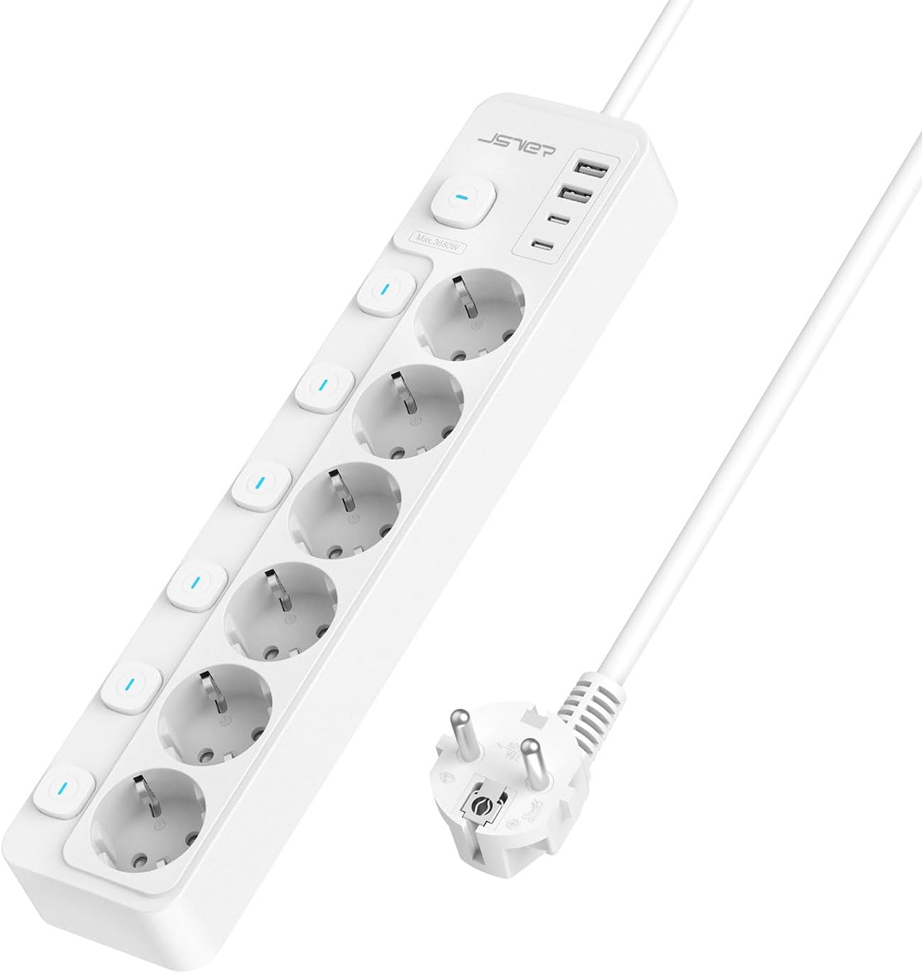 JSVER Bloc multiprise USB avec 6 prises et 4 ports USB (2 USB-A + 2 USB-C) et interrupteurs individuels, 2 m, blanc
