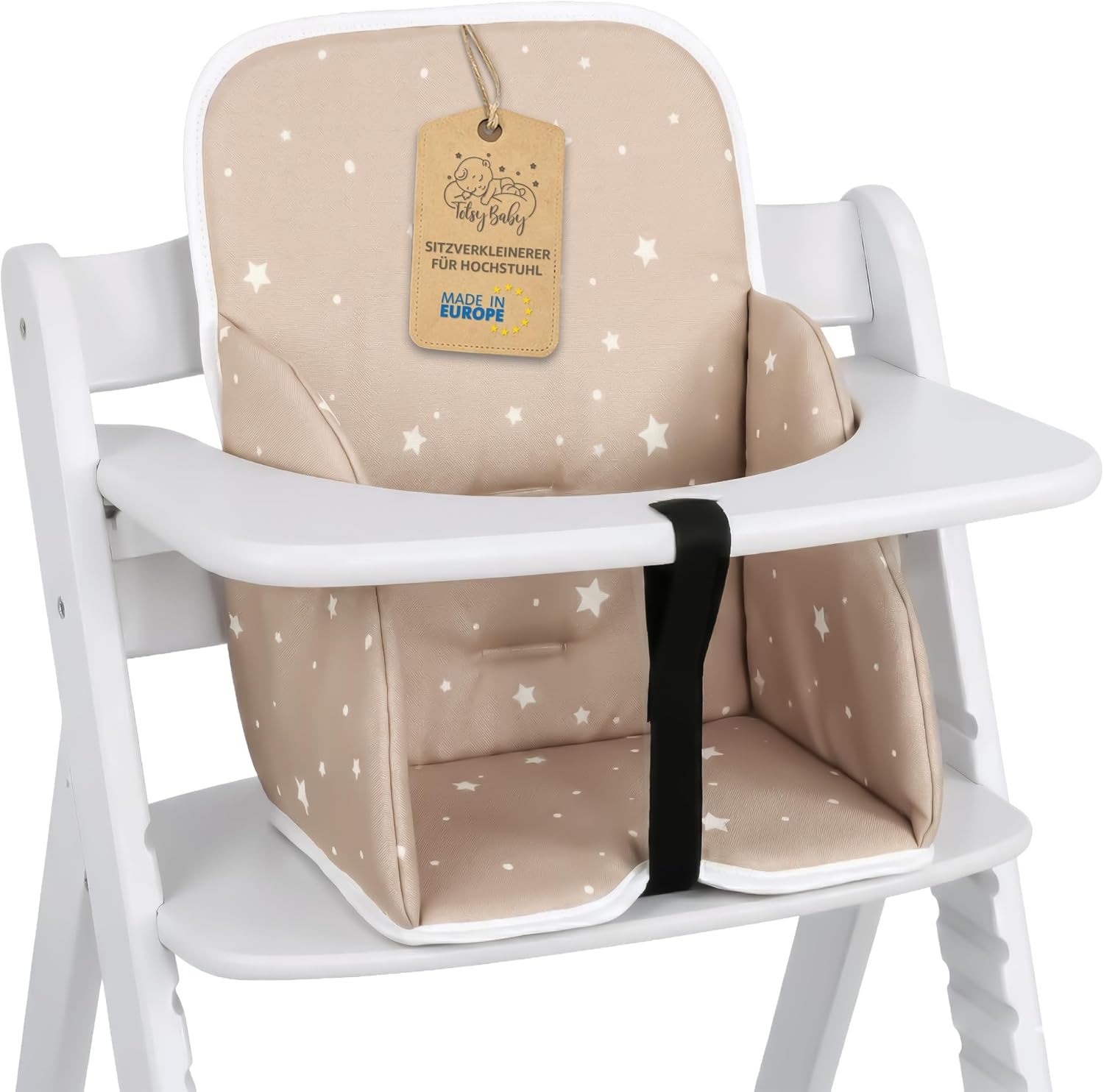 Housse chaise haute bébé avec coussin d’assise imperméable beige à étoiles (réducteur de siège)