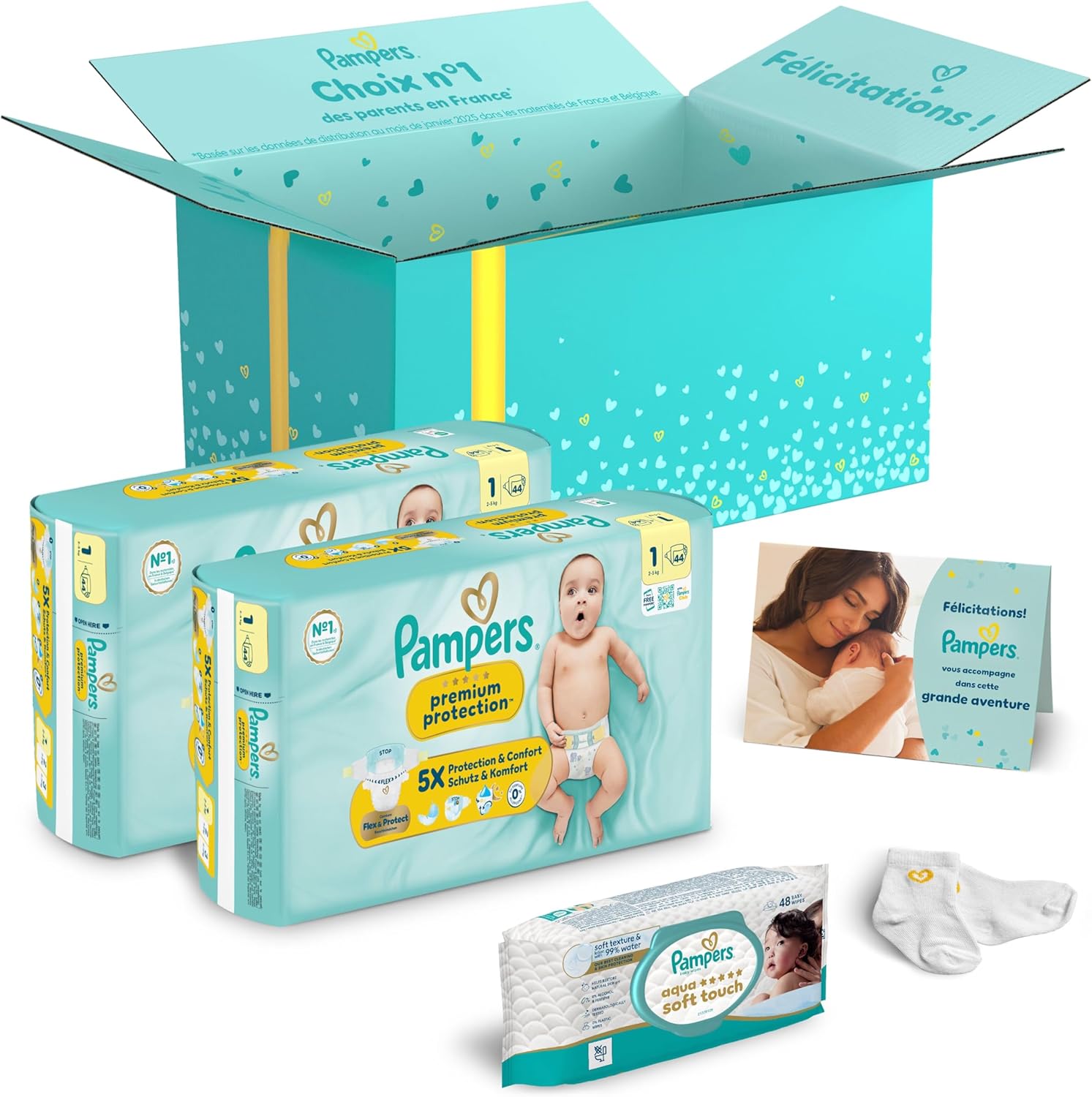 Coffret cadeau naissance Pampers Premium Protection (Taille 1) + lingettes Aqua Soft Touch
