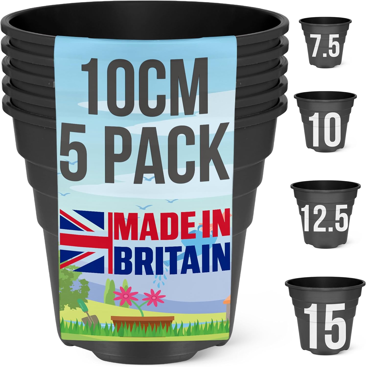 Happy Pots pot de fleurs en plastique 10 cm – lot de 5 – avec trous de drainage (noir, fabriqué au Royaume-Uni)