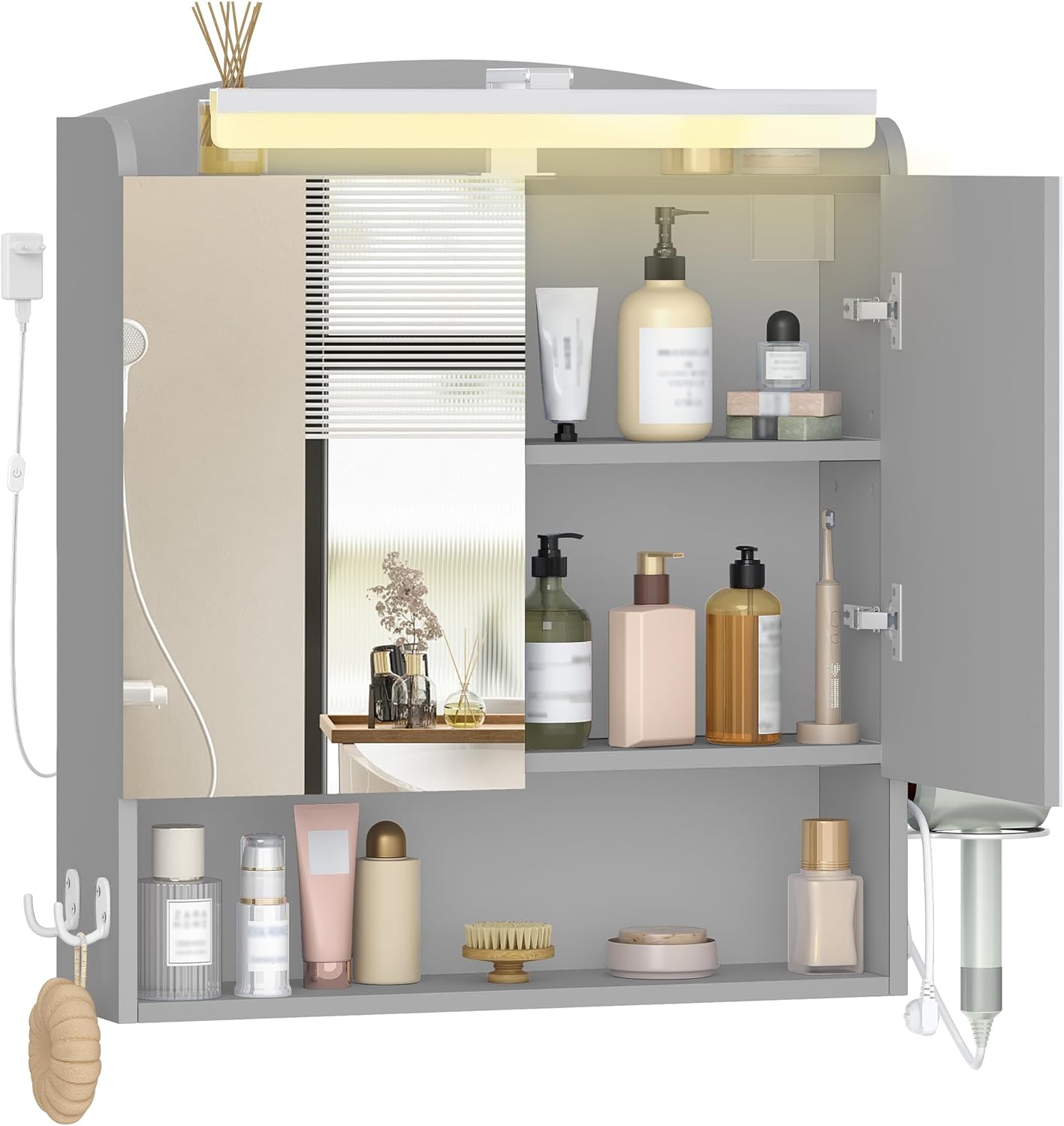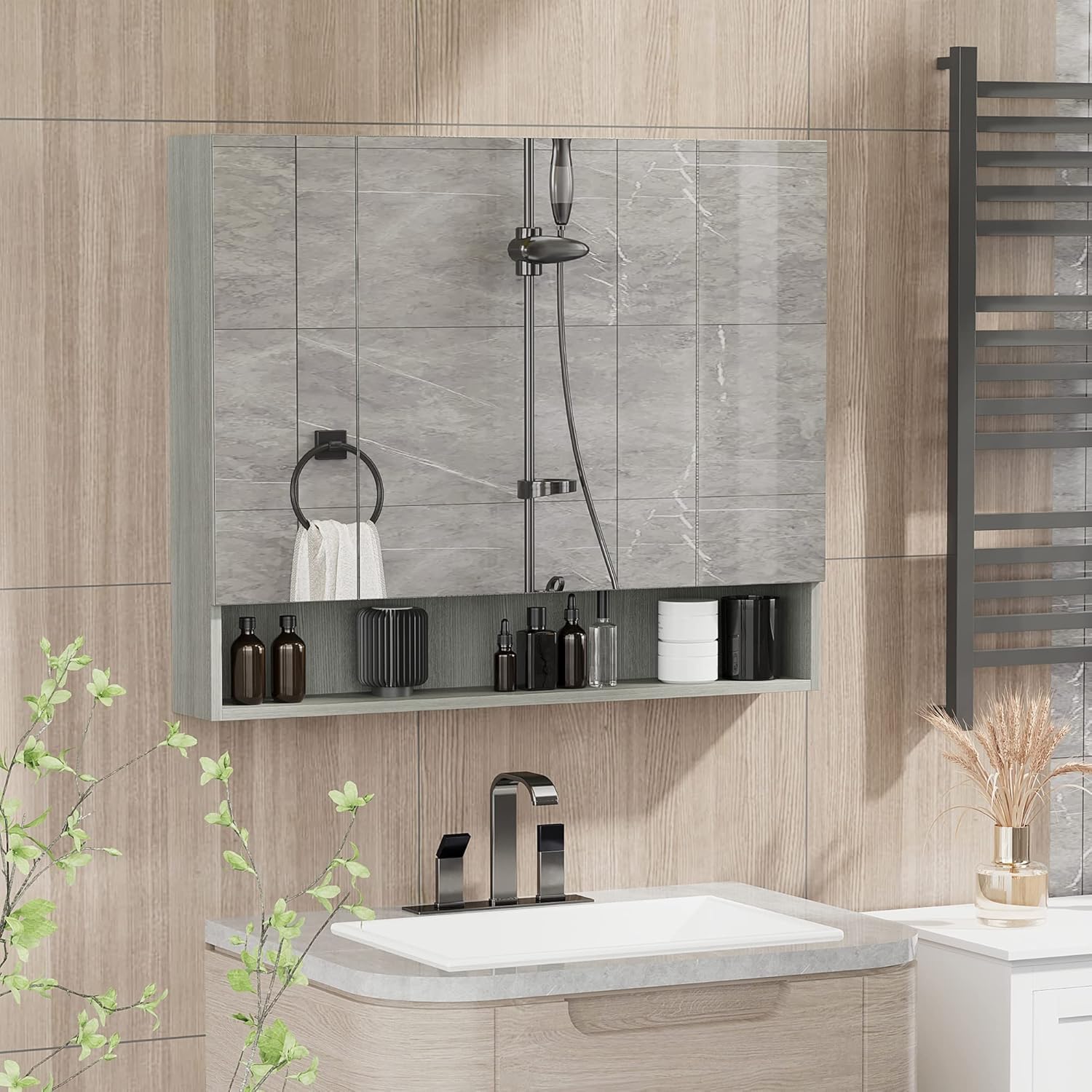 kleankin Armoire murale de salle de bain avec miroir et 3 portes, 90 x 15 x 75 cm, gris