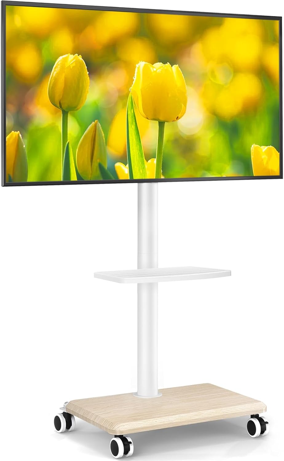 - TVON Support TV sur pied à roulettes universel blanc et bois pour téléviseurs 32 à 65 pouces (VESA jusqu’à 400×400 mm)