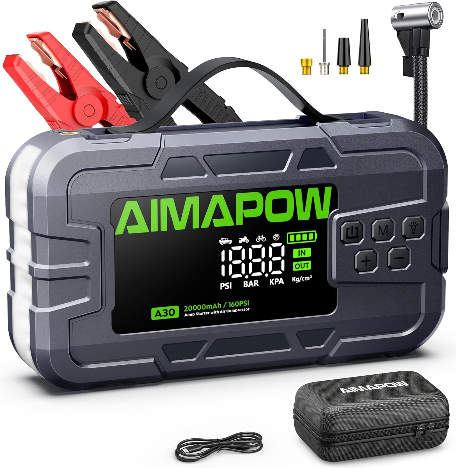 AIMAPOW Booster Batterie Voiture 12V 8000A avec compresseur 160 PSI, démarreur portable et lampe LED 600 lm