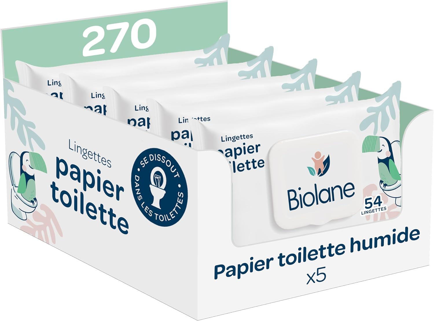 Biolane Papier toilette humide – Lot de 5 paquets (54 feuilles) – Fibres végétales, dès la naissance