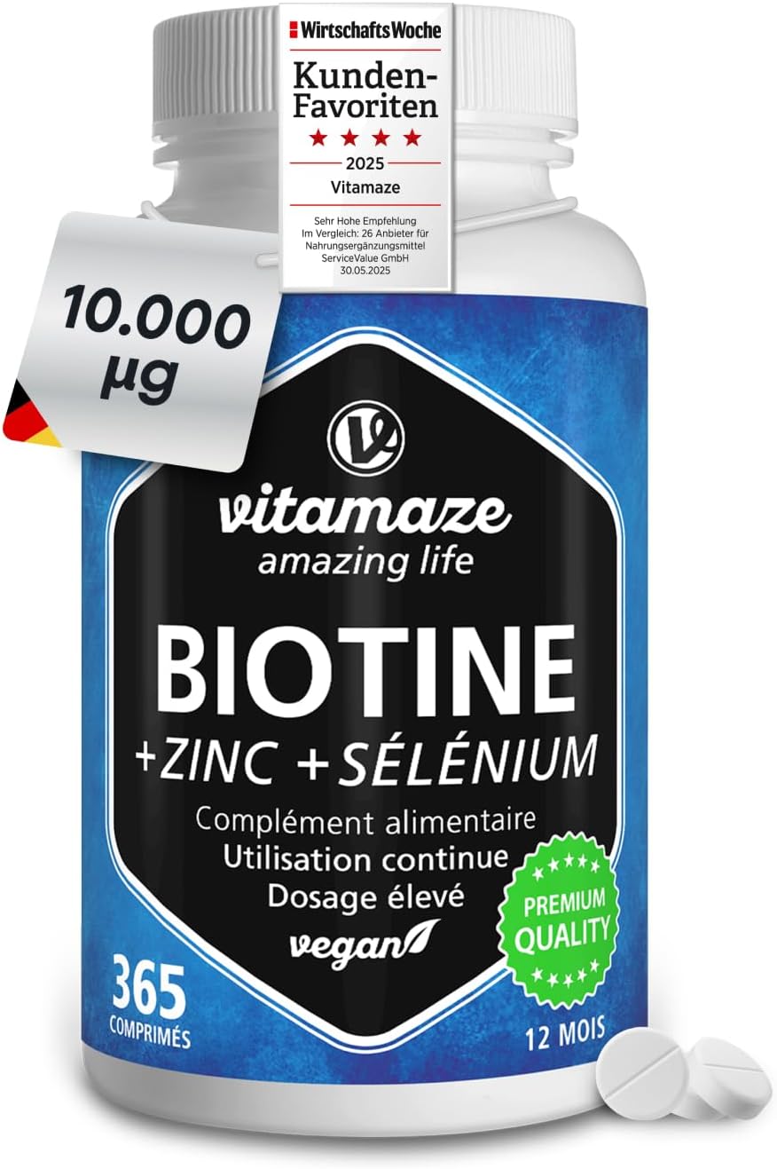 La biotine (vitamine B8) reste l’un des compléments les plus recherchés quand on veut soutenir la routine autour des cheveux et des ongles. Ici, le Biotine Complexe 10.000 mcg se présente sous forme de micro-comprimés et mise sur une formule “complète” : biotine, sélénium et zinc, avec une logique d’utilisation sur la durée (365 micro-comprimés pour 1 an d’utilisation continue, selon l’indication produit).