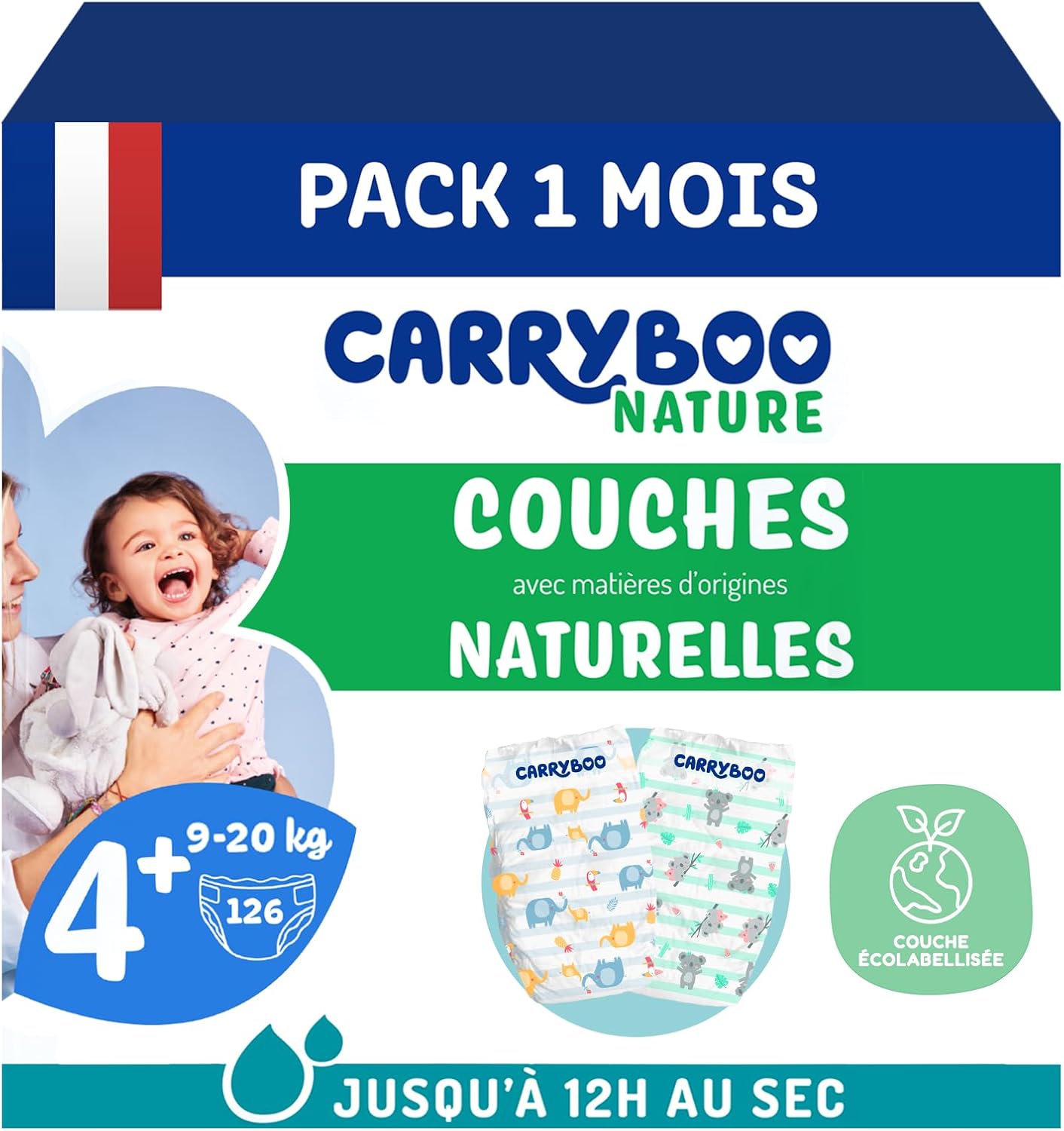 CARRYBOO Couches taille 4+ (9-20 kg) peaux sensibles – pack 1 mois, 12h anti-fuites, fabriquées en France