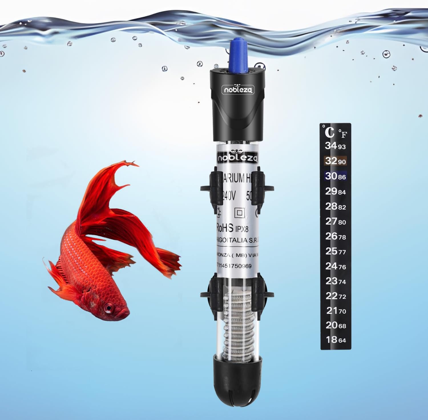 Ce chauffage d’aquarium Nobleza 50 W est conçu pour maintenir une eau à une température stable, tout en restant simple à régler au quotidien. Il s’adresse en priorité aux aquariums d’environ 10 à 50 L : sur ce type de volume, le 50 W a du sens si tu veux un chauffage “prêt à l’emploi”, avec une plage de réglage lisible.