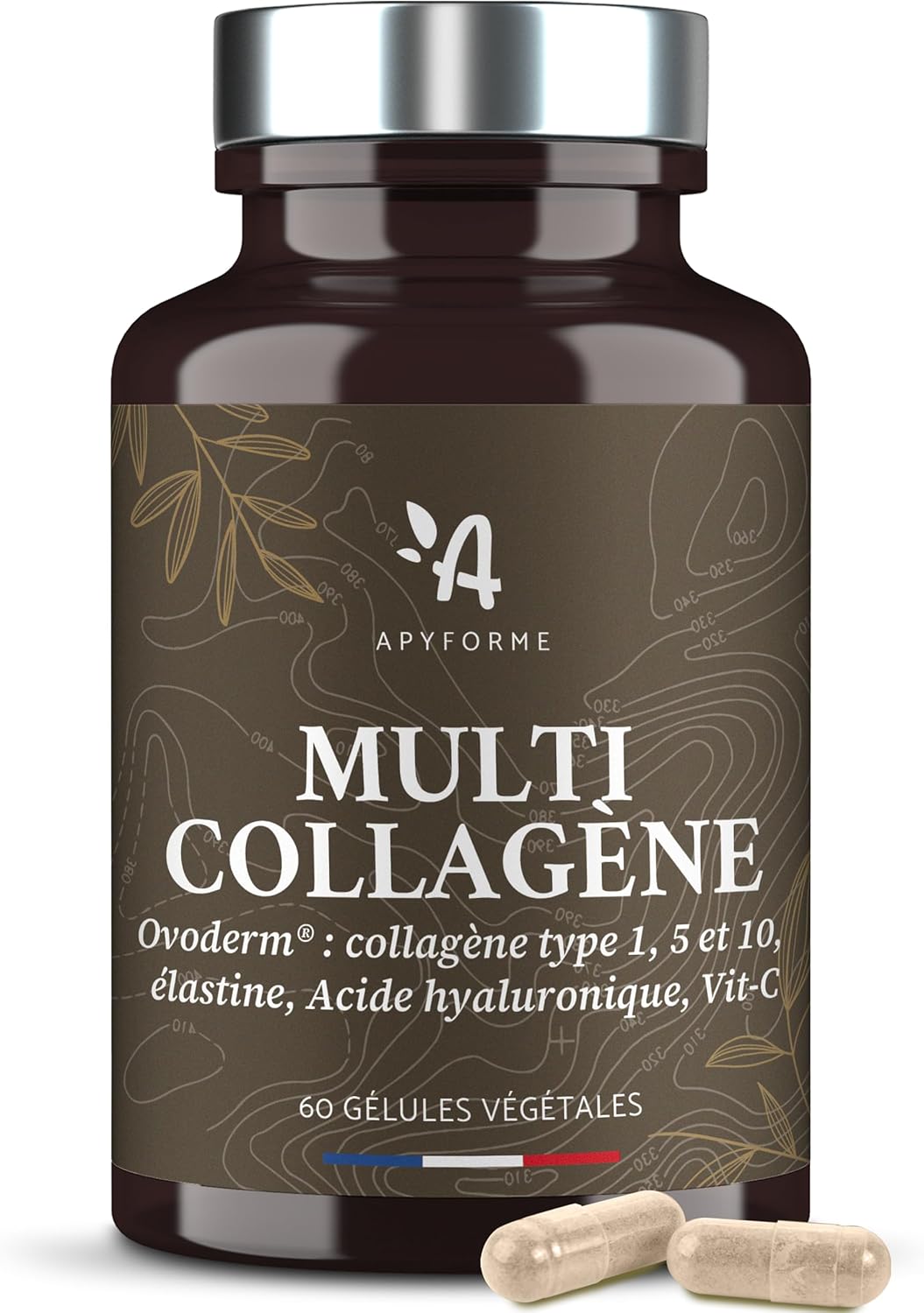 Ce complément multi collagène d’Apyforme associe collagène breveté à de l’acide hyaluronique pour soutenir fermeté et hydratation de la peau. Il vise aussi à renforcer articulations et os, en usage quotidien, et se présente en pilulier pratique, fabriqué en France. Pour une prise simple, la marque recommande une gélule par jour selon études cliniques et concentration des actifs. ✅