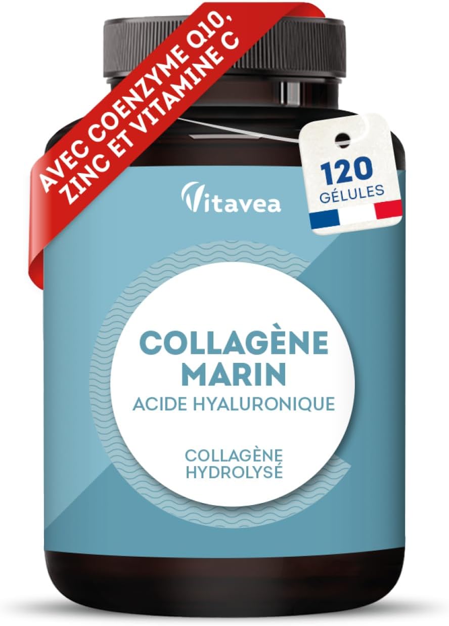 - Contenu: 120 gélules. Principaux composants: collagène marin hydrolysé Type 1 et 3, acide hyaluronique, coenzyme Q10, vitamine C, zinc. Fabriqué en France, avec contrôle de qualité strict.