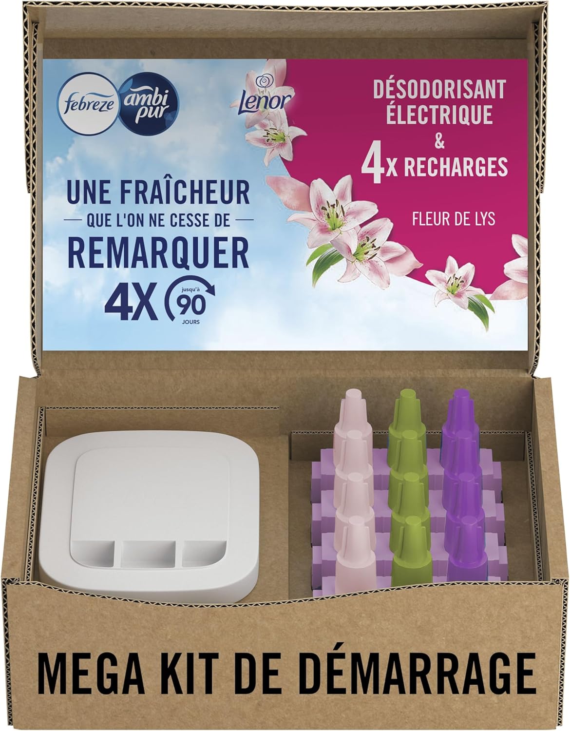 Kit désodorisant électrique Febreze – 1 diffuseur + recharges (20 ml) + 3 parfums en alternance, Fleur de Lys