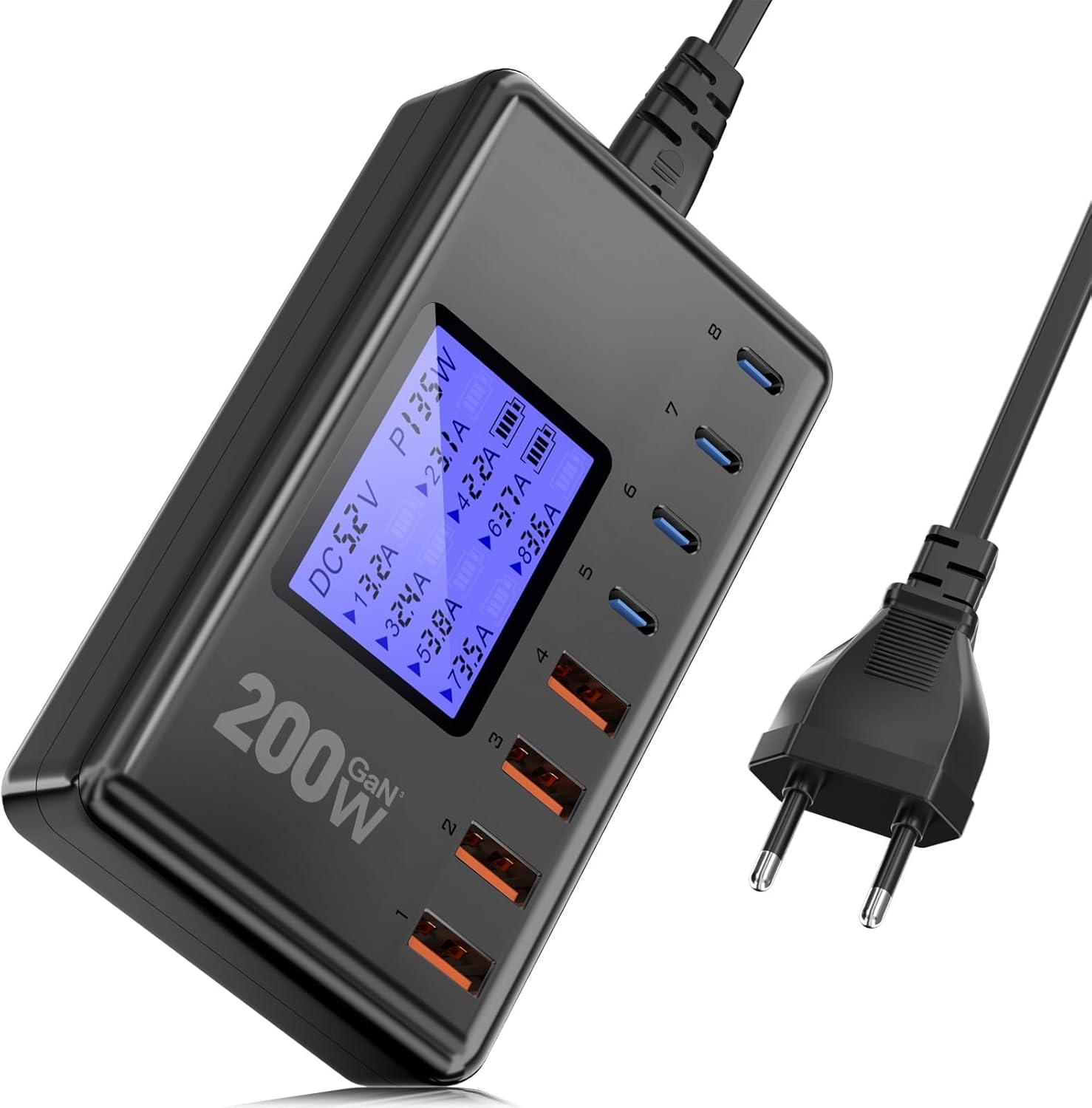 DKESMP Chargeur rapide GaN 200 W à 8 ports (4× USB-C PD 30 W + 4× USB-A QC 18 W) avec écran LCD