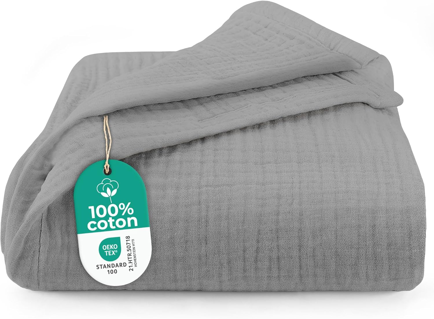 Dreamzie Couverture en mousseline 220x240 cm en coton (4 couches) gris clair – légère, respirante et lavable à 30 °C