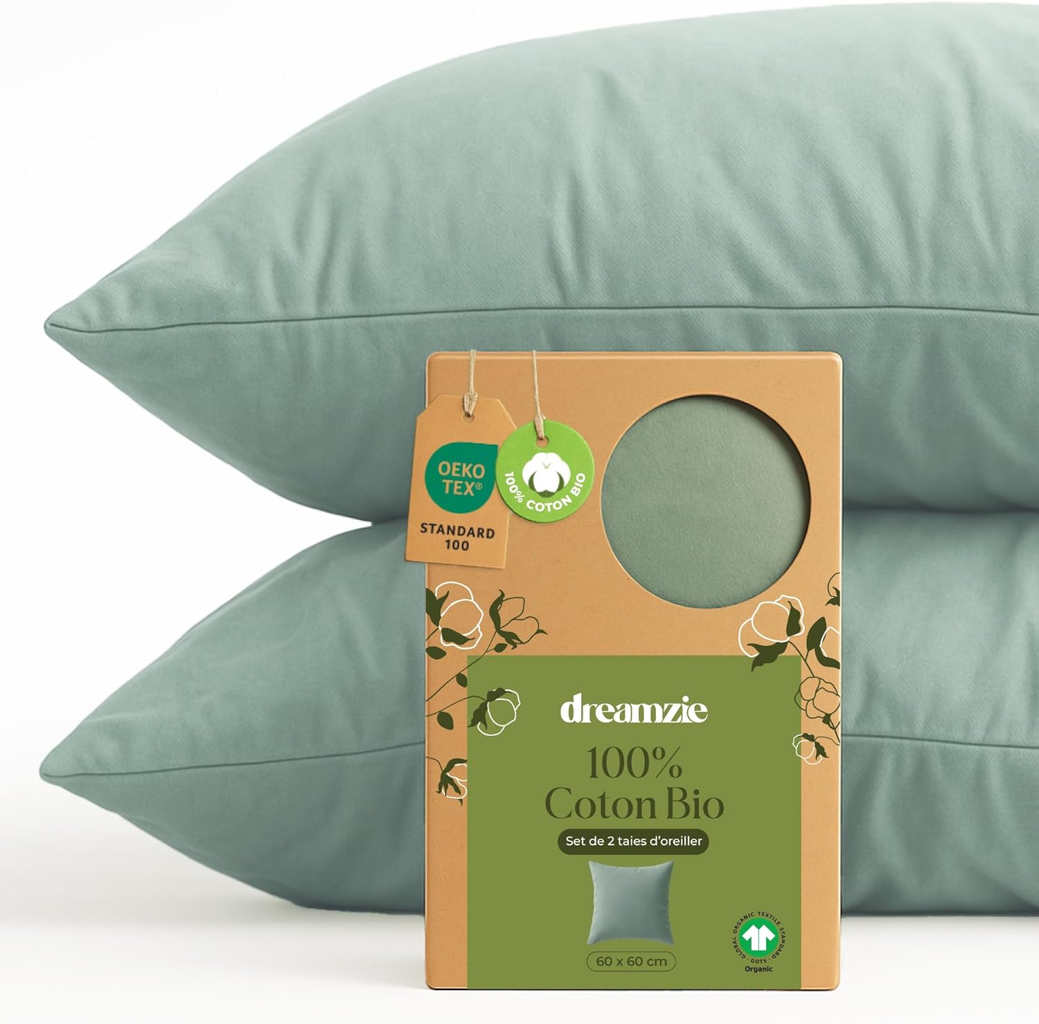 Dreamzie Taie d’oreiller 60x60 cm en coton biologique (lot de 2) vert, fermeture éclair