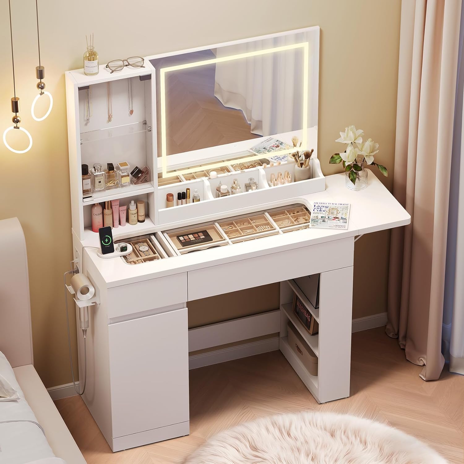 Si tu cherches une coiffeuse qui fasse aussi “poste de travail” au quotidien, la Dripex avec éclairage et prises intégrées a de quoi séduire sur le papier. L’idée est simple : un miroir généreux pour le maquillage, un plateau en verre trempé pour garder une allure moderne, et surtout une organisation de rangement pensée pour éviter le bazar.