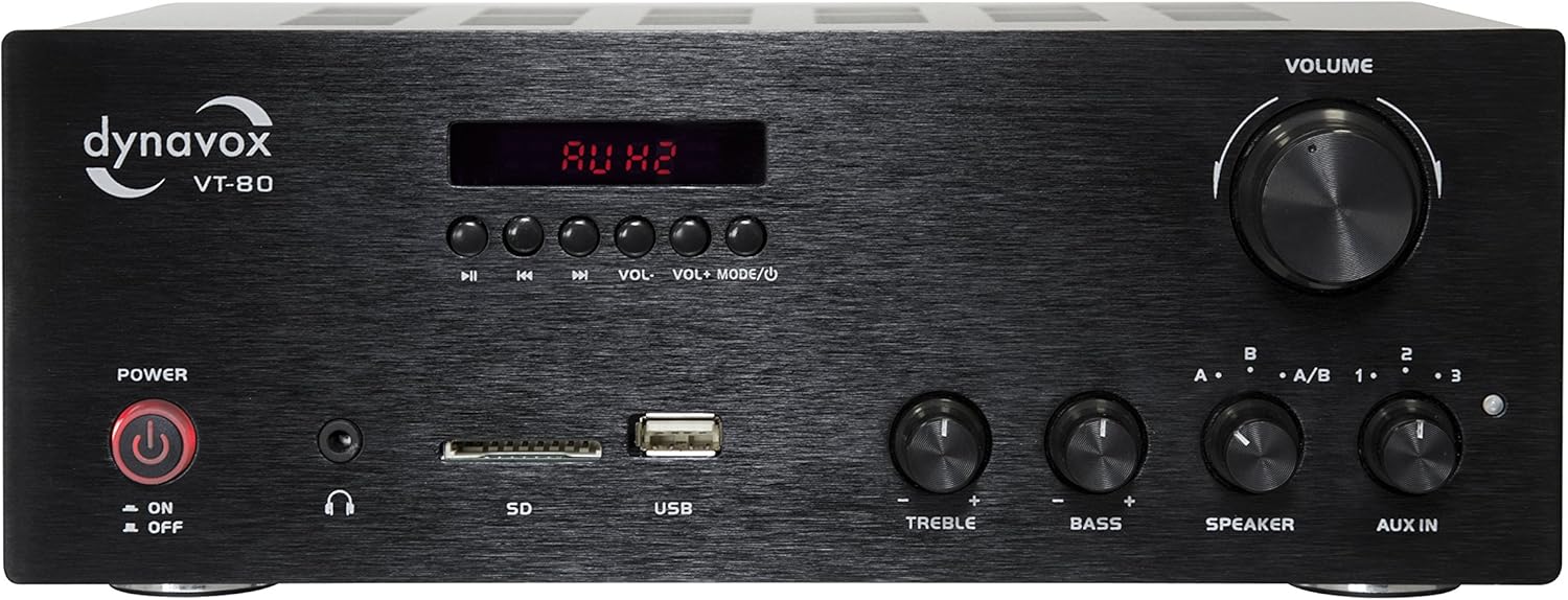 Le Dynavox VT-80 est une option intéressante si tu veux un amplificateur stéréo compact, capable de gérer à la fois le streaming Bluetooth et des sources via USB / carte SD, tout en gardant une voie analogique (RCA) et une sortie Pre-Out pour un subwoofer actif.