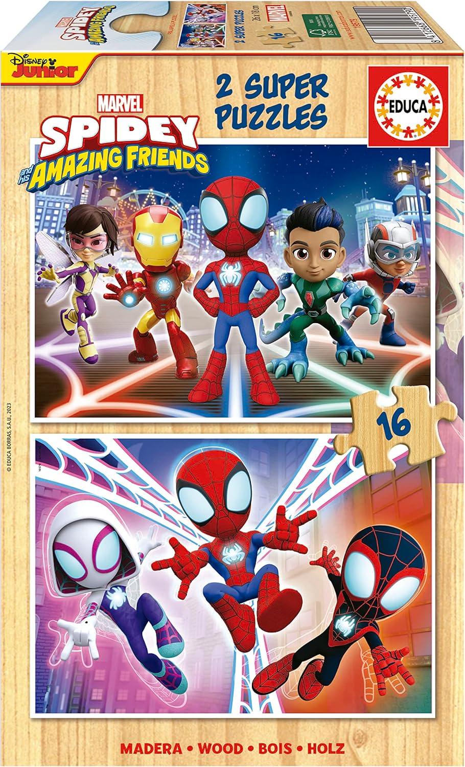 Educa Spidey & Amazing Friends – Ensemble de 2 puzzles en bois (16 pièces chacun) +3 ans, 26 x 18 cm