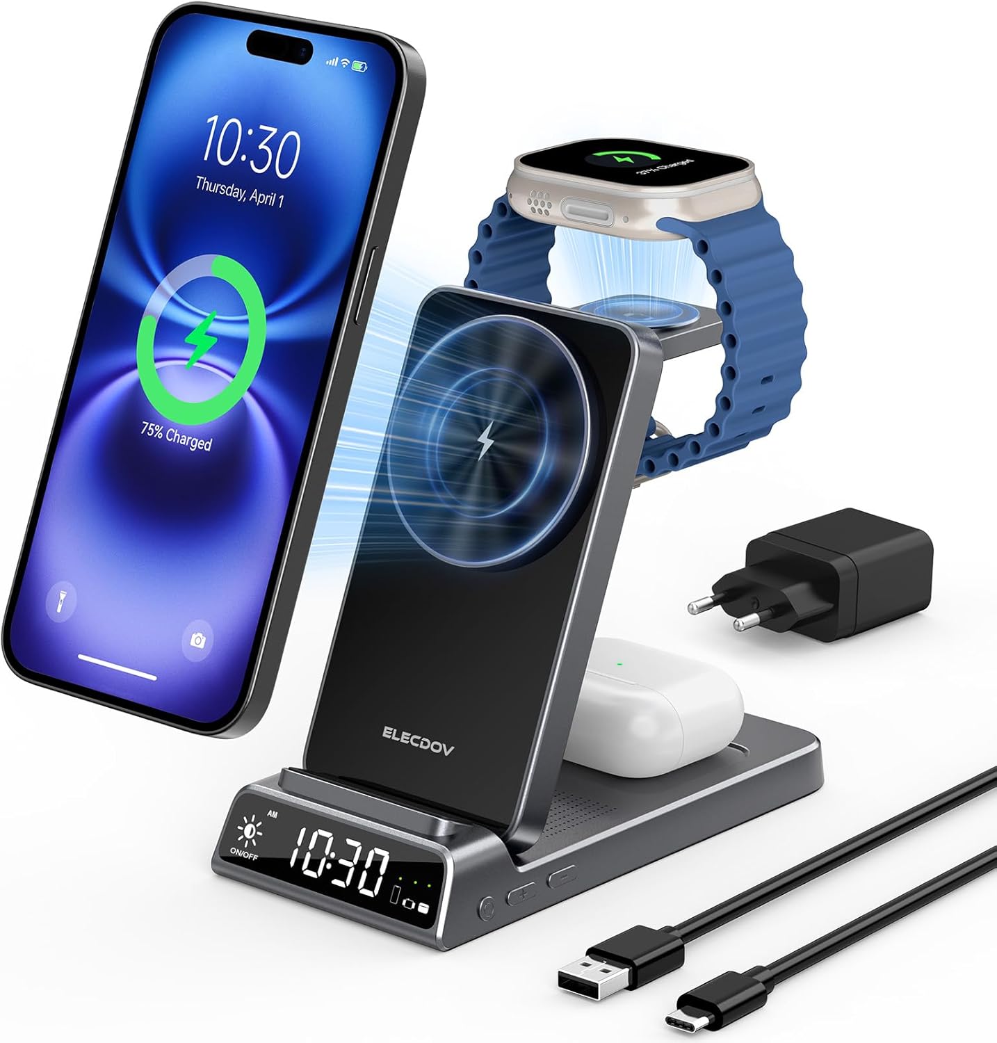 Elecdov Station de charge magnétique sans fil 3 en 1 avec horloge (pliante, compatible Apple) — Chargeur iPhone, Apple Watch et iWatch 10