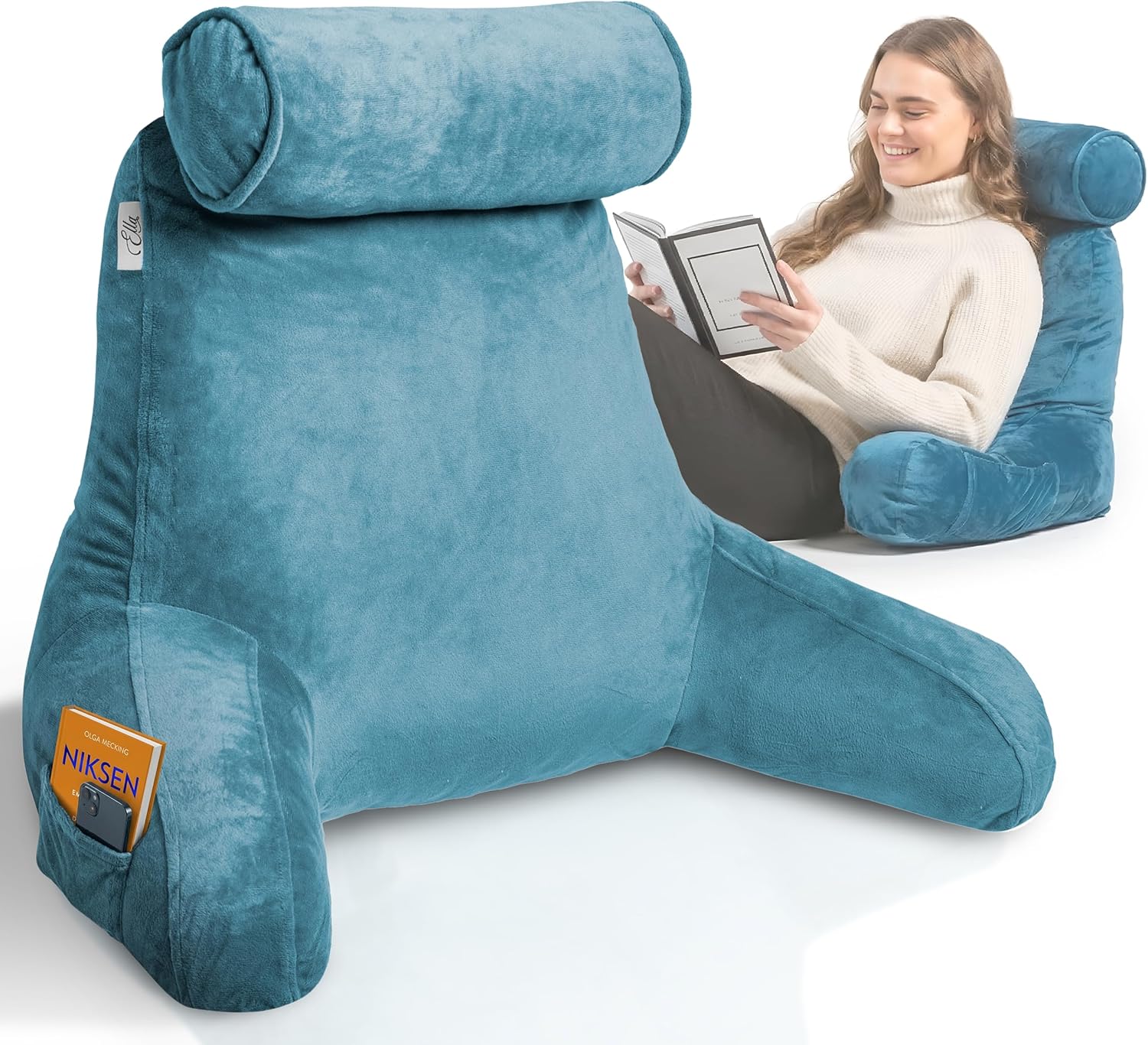 Ella Coussin de lecture avec rouleau de cou et accoudoirs en velours (bleu) — oreiller pour fauteuil, dos et nuque