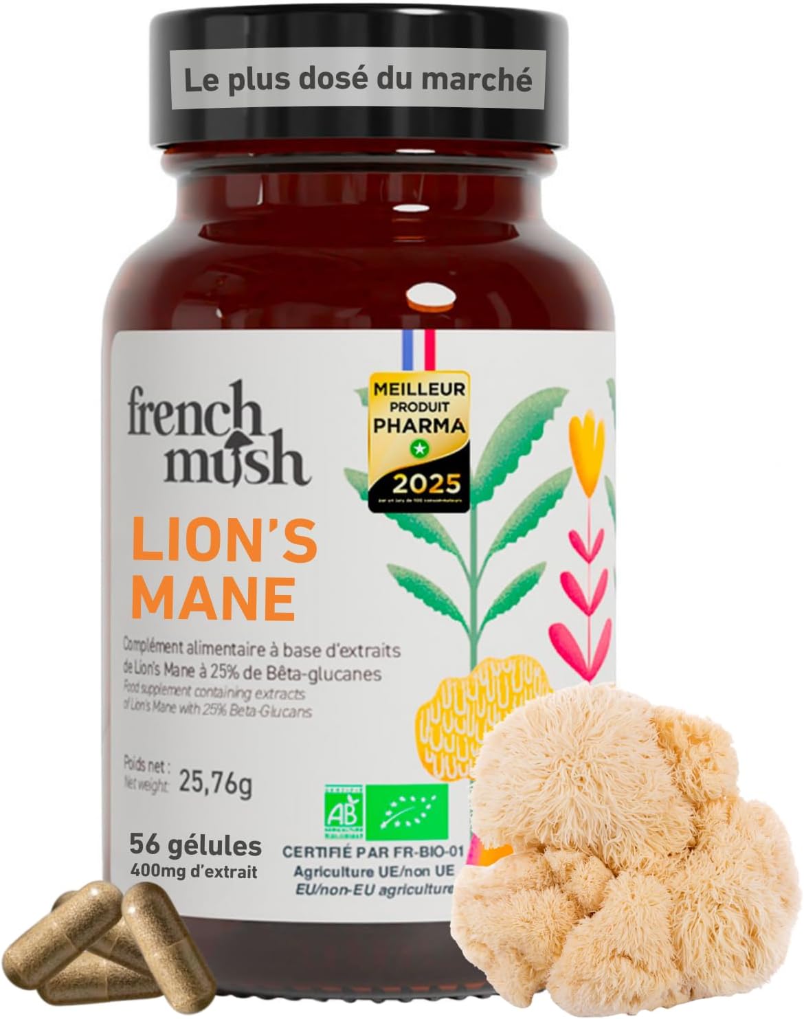 French Mush indique que l’extrait est 100% vegan et bio. Le complément se présente en gélules, avec une recommandation d’1 à 2 gélules par jour.