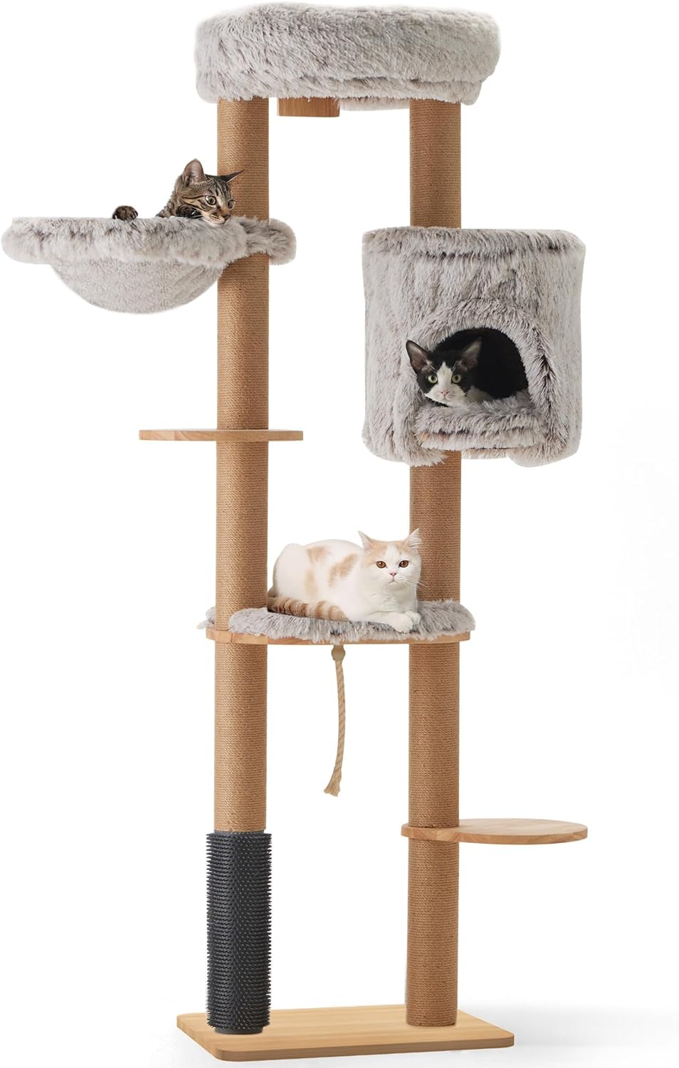 FUKUMARU Arbre à chat mural de 188 cm en bois de caoutchouc massif, multi-niveaux avec griffoir et panier suspendu
