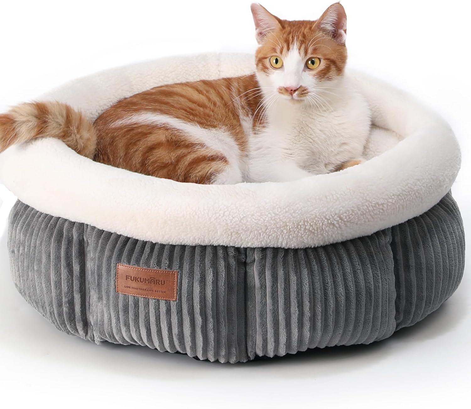 FUKUMARU Lit pour Chat rond en peluche (cordon d’intérieur) – Gris