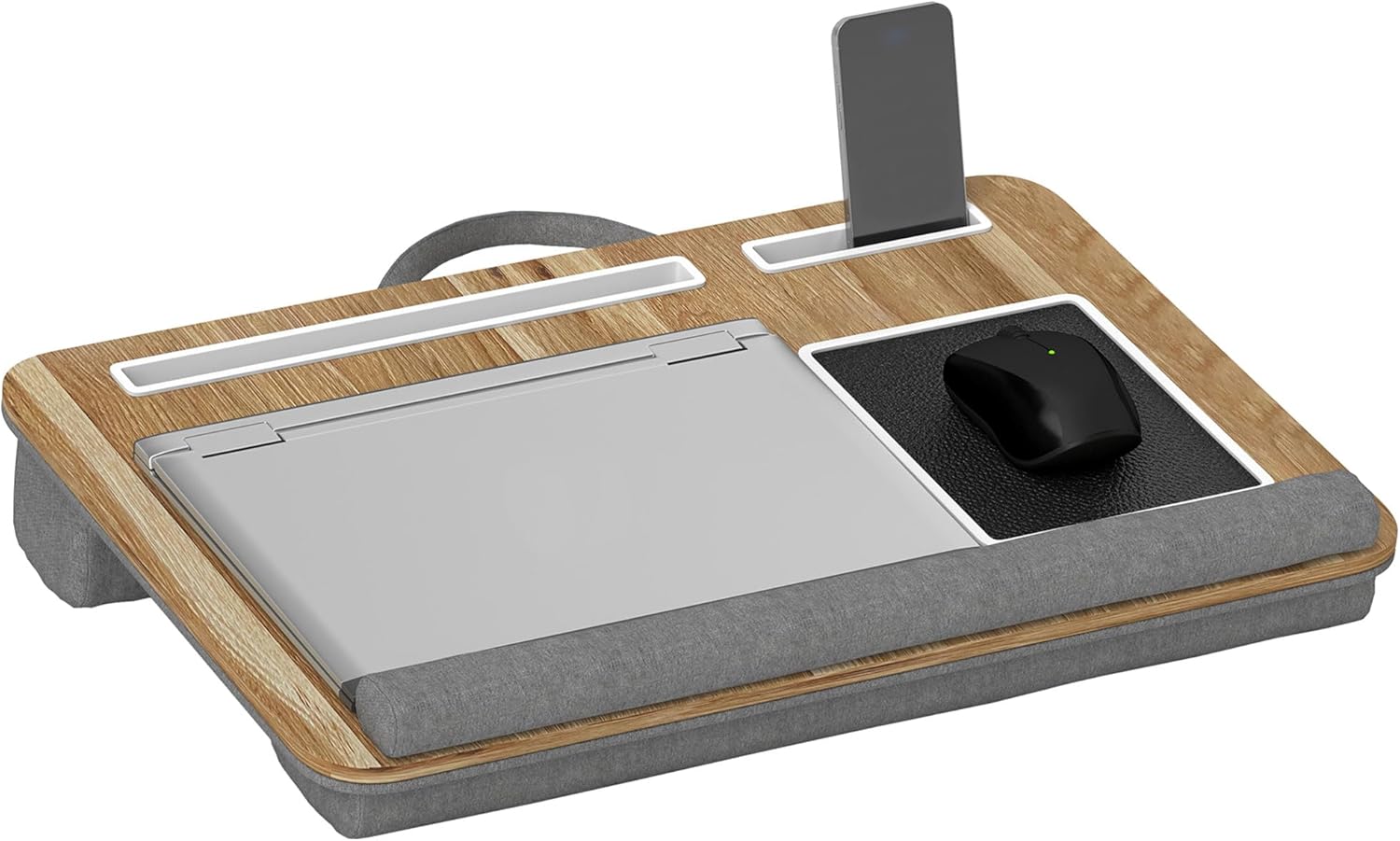 Ce plateau polyvalent transforme votre lit ou canapé en espace de travail confortable. Fabriqué pour accueillir un ordinateur portable jusqu’à 15,6 pouces, il offre une large surface de 55,5 x 37 cm idéale pour lire, écrire ou regarder des contenus en détente. Le plateau est équipé de fentes intégrées pour tablette ou téléphone et d’un tapis de souris au revêtement texturé qui assure une meilleure glisse et une stabilité accrue. Le coussin d’appui est conçu avec un double renfort et l’ensemble se prolonge d’un repose-poignet qui agit aussi comme butée, réduisant la tension sur les poignets. Léger, pratique et doté d’une poignée sur le dessus, il se transporte facilement d’une pièce à l’autre et se glisse en poche dans un sac pour voyager léger. Cette solution offre un vrai gain de confort et d’organisation au quotidien, que ce soit pour travailler, étudier ou se divertir. Le design sobre et fonctionnel s’adapte à tous les intérieurs et se distingue par son utilité dans la vie courante, sans compromis sur la stabilité et la durabilité. 😊 Sa facilité d’emploi en fait un compagnon idéal pour les sessions longues devant l’ordinateur ou pour des moments d’étude en déplacement. Le bois ou les matières utilisées apportent une sensation de solidité rassurante et un bon rapport qualité-prix, apprécié par les utilisateurs exigeants. En résumé, ce plateau vous donne un espace dédié et ergonomique, où que vous soyez, tout en restant léger et portable. 👌
