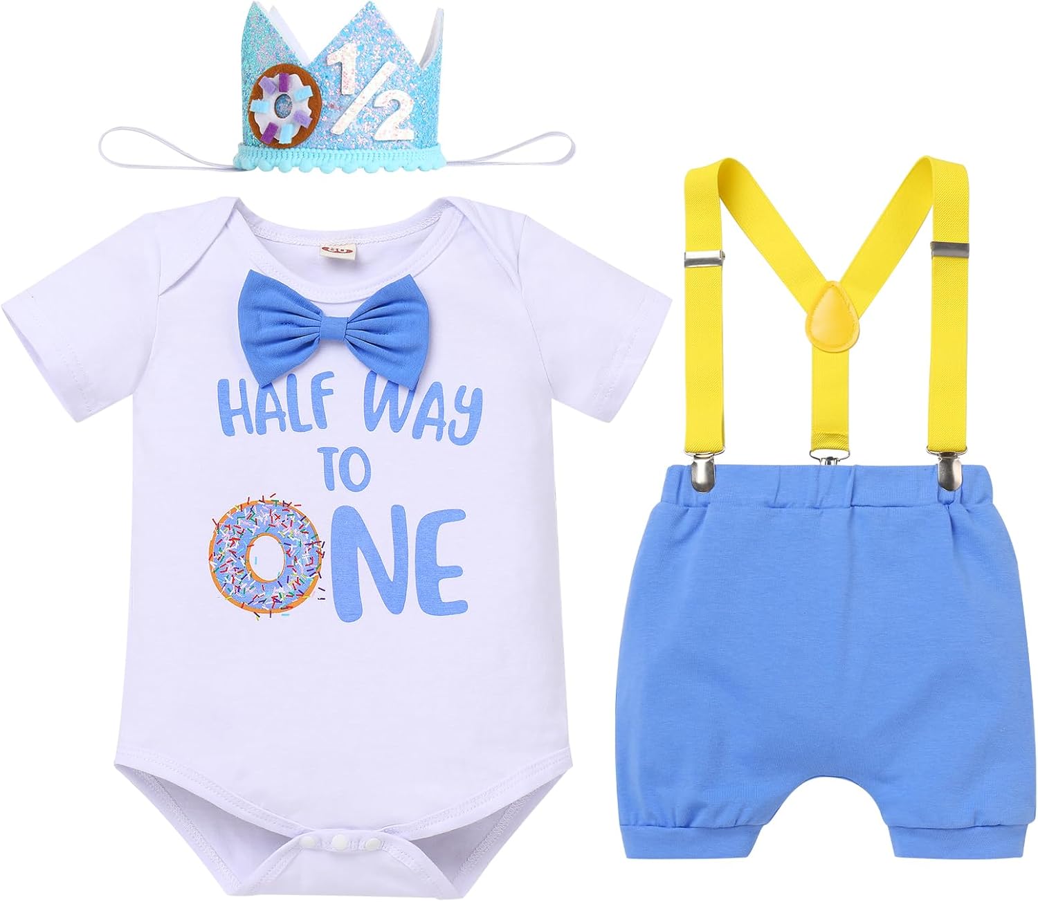 IDOPIP Costume bébé garçon 6-9 mois anniversaire : combinaison, short à bretelles et couronne pour les photos