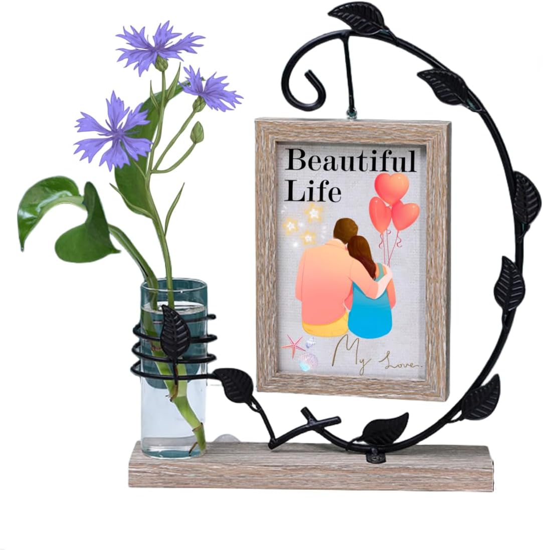 Si tu veux qu’un cadre photo ne se limite pas à “encadrer une image”, le modèle Lajiakoy joue clairement cette carte : on est sur un cadre en bois noir associé à un support en métal travaillé, avec un décor en feuilles métalliques et un petit vase. Sur le papier, c’est plus un objet décoratif qu’un simple accessoire mural.