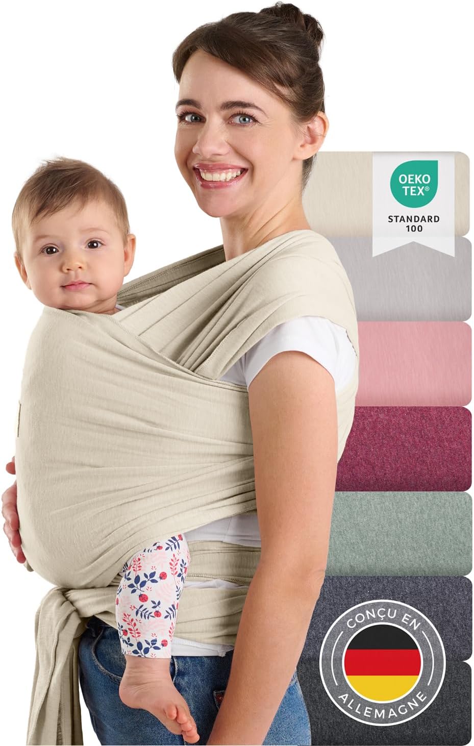 Laleni écharpe de portage bébé nouveau-né jusqu’à 15 kg en coton OEKO-TEX, beige (porte-bébé physiologique)
