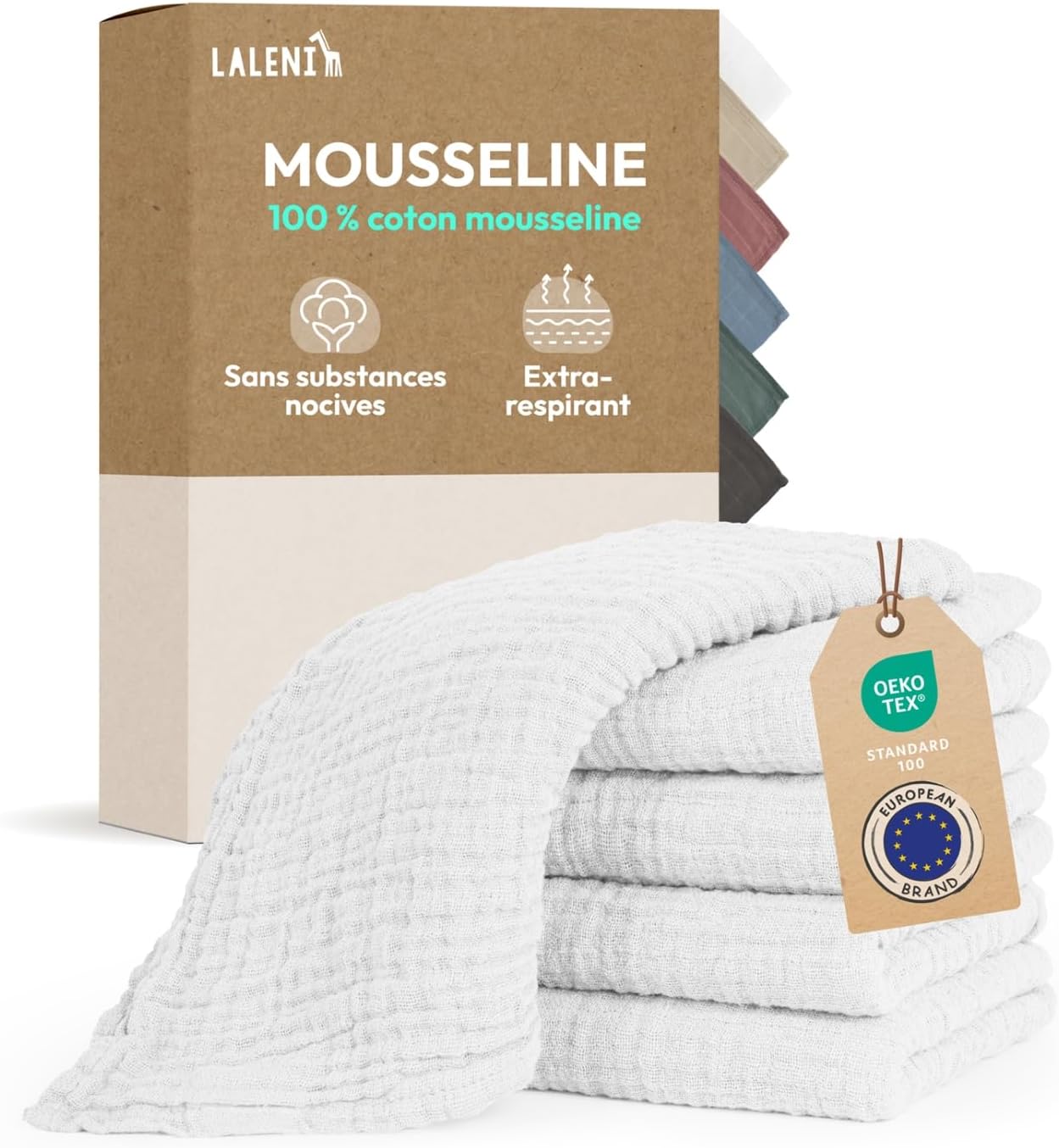 Ce lot de 5 bavoirs bébé en mousseline de coton (format 70 x 70 cm) est pensé pour les moments du quotidien où bébé salit vite : repas, goûters, biberons… La mousseline, sur le papier, a un intérêt simple : elle combine une bonne capacité d’absorption et une texture légère, ce qui peut être pratique quand on enchaîne les lavages. Ici, Laleni annonce un tissu doux pour la peau sensible, et surtout une démarche “sans polluants” avec une certification OEKO-TEX.