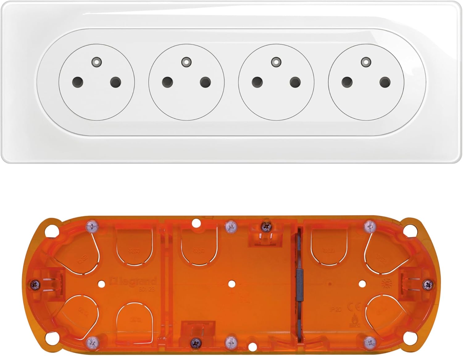 Cette référence est présentée comme un kit comprenant une quadruple prise et une boîte à encastrer. Pour un projet, c’est souvent le genre de détail qui change la vie : tu évites de chercher un support séparé au dernier moment.