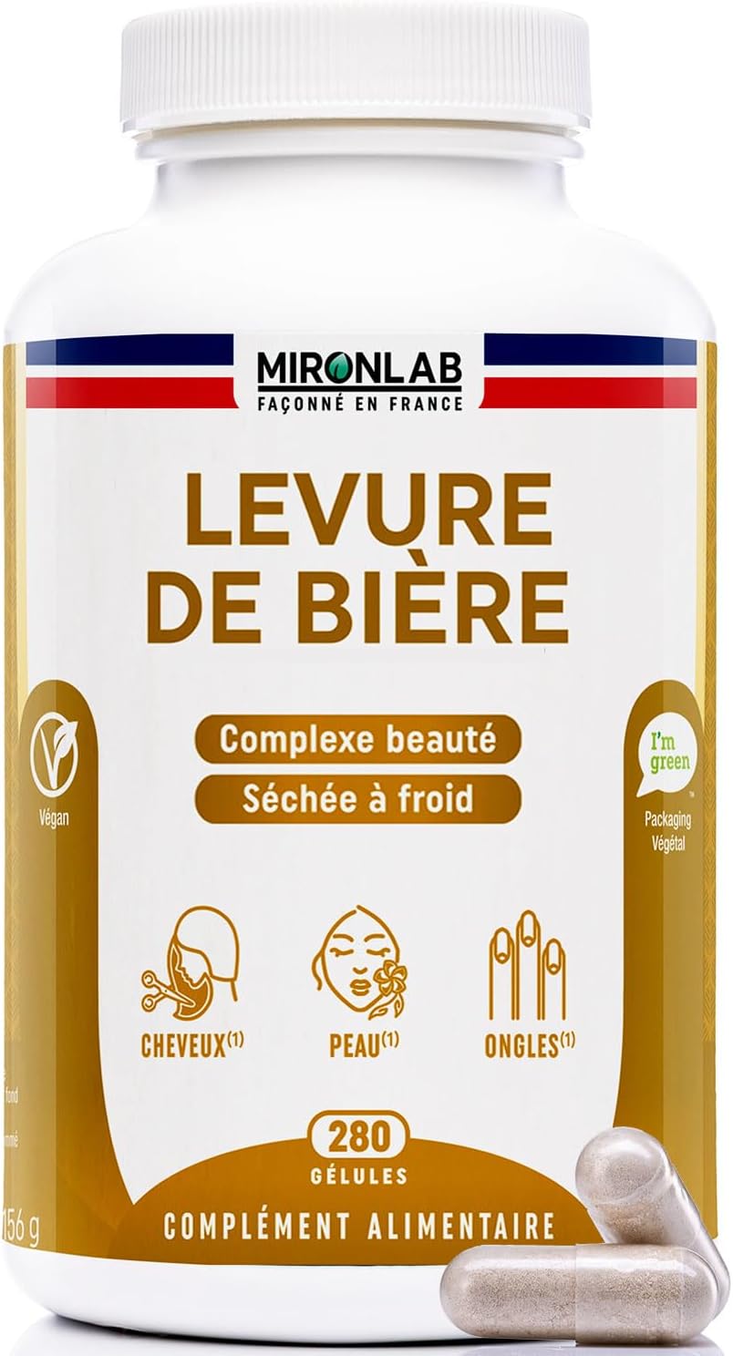 La Levure de Bière Active de MironLab est présentée comme un complément alimentaire ciblant la pousse des cheveux, la beauté de la peau et la santé des ongles. Sa formulation associe la levure de bière à des vitamines et minéraux (notamment B5, B6, B8, B9, Zinc, Cuivre et Sélénium) afin de soutenir les cheveux de l’intérieur et d’accentuer les effets positifs sur l’épiderme et les ongles. Le produit est présenté comme vegan, sans OGM, sans additifs ni pesticides, et fabriqué en France à Saint Georges les Bains. Une promesse d’action sur la flore intestinale est évoquée comme avantage secondaire.