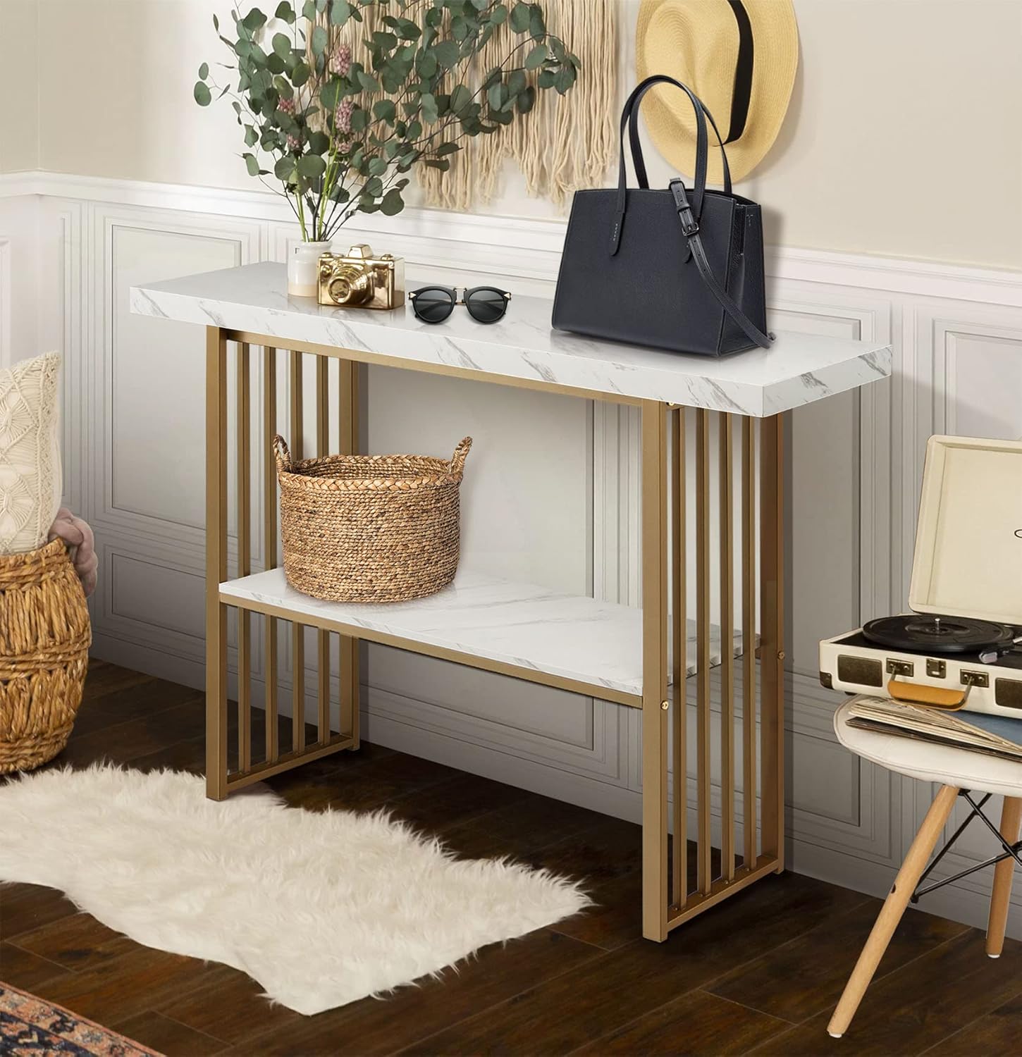 LIFEZEAL Table Console à 2 Niveaux – Plateau faux marbre blanc et cadre doré, 120 x 30 x 93 cm