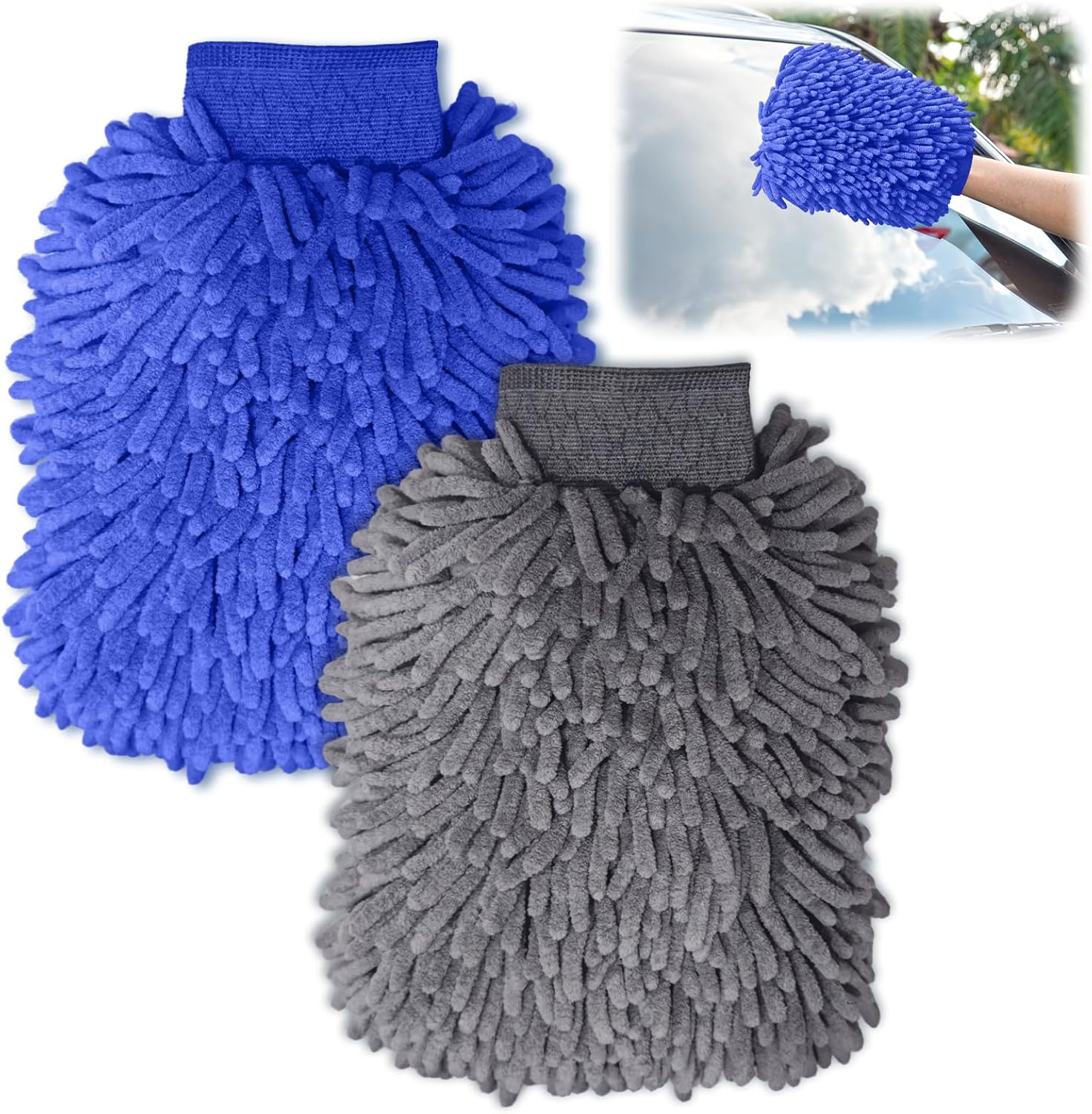 Lot de 2 gants en microfibre pour lavage et séchage voiture (gris + bleu) — protection anti-rayures