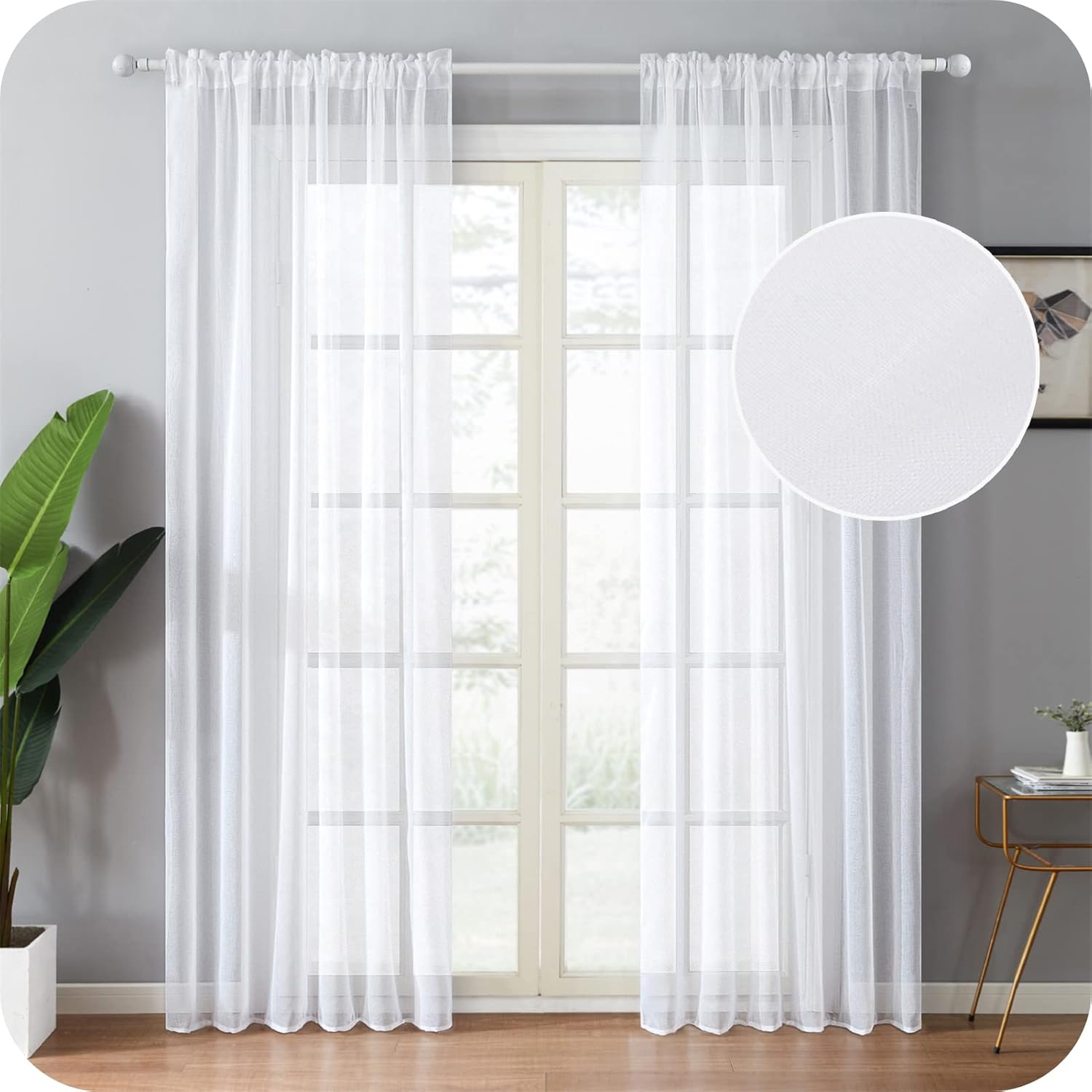 Topfinel propose un lot de 2 rideaux en voile blanc semi-transparent, pensé pour apporter de la lumière tout en gardant un minimum d’intimité. Le principe est simple : le tissu filtre la lumière du soleil pour créer une ambiance plus douce, sans assombrir la pièce comme peuvent le faire des voilages très opaques.