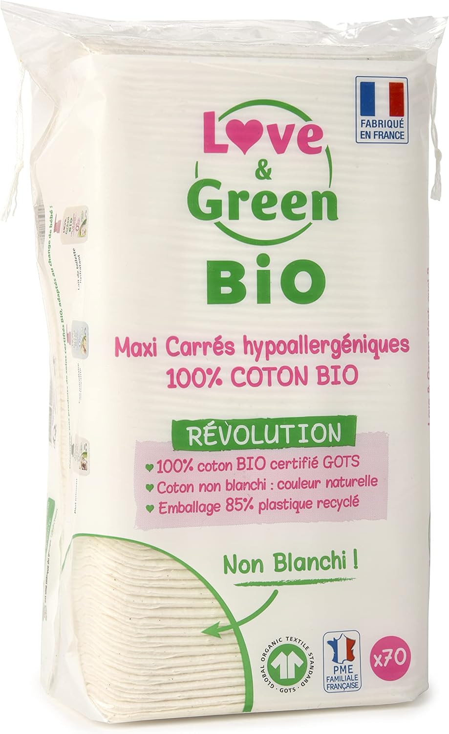 Love & Green Cotons Maxi Carrés hypoallergéniques 100% bio (x70) – change & toilette bébé, fabriqués en France